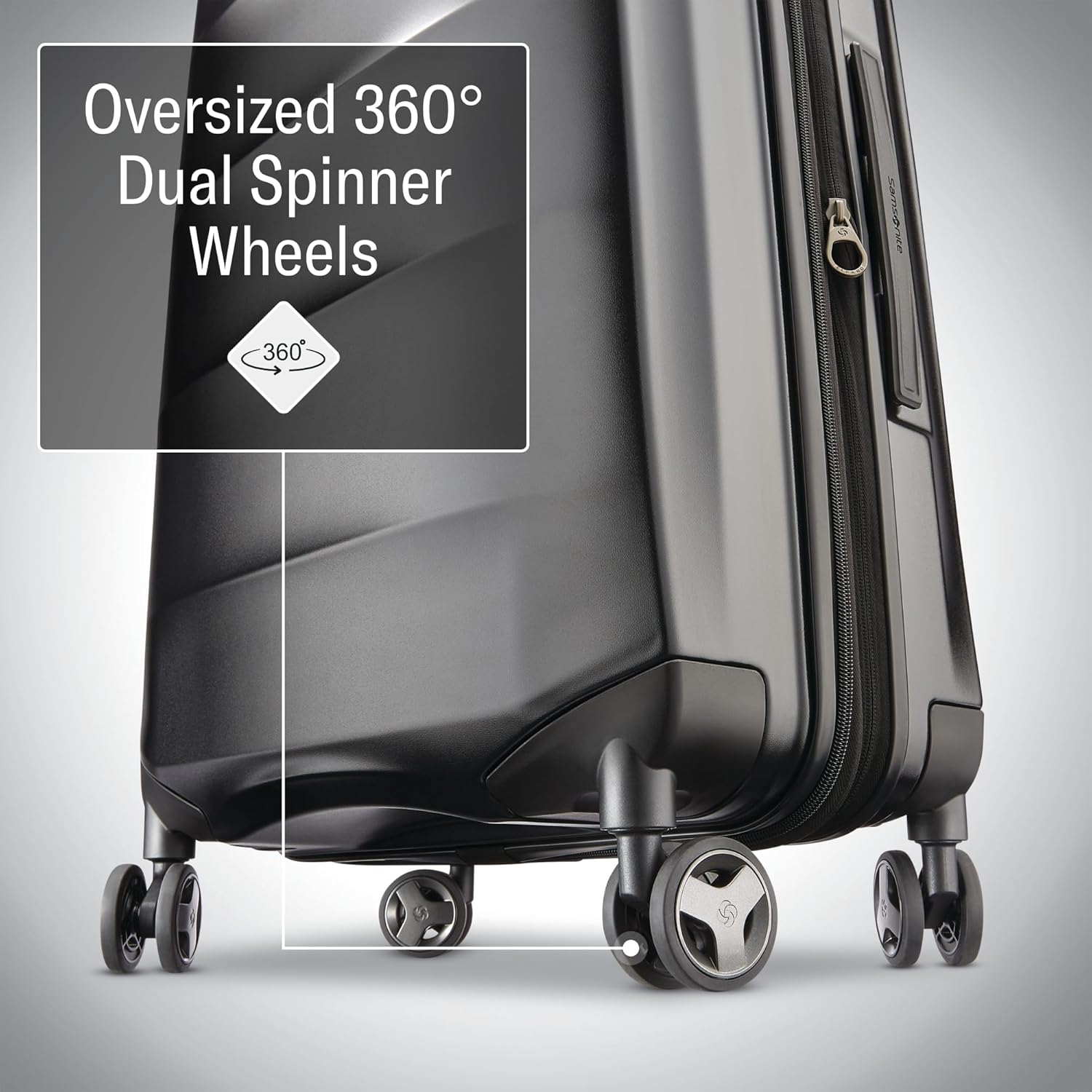 - PATENTED 360° SPINNER WHEELS WITH AERO TRAC SUSPENSION TECHNOLOGY: The Octiv Large Checked suitcase features 4 dual spinner wheels designed with Samsonite’s Aero Trac Suspension Technology which absorbs the vibrations and bounces for smooth and steadier movement. Each wheel rotates 360°, ensuring effortless and easy control when pulling your luggage in any direction.