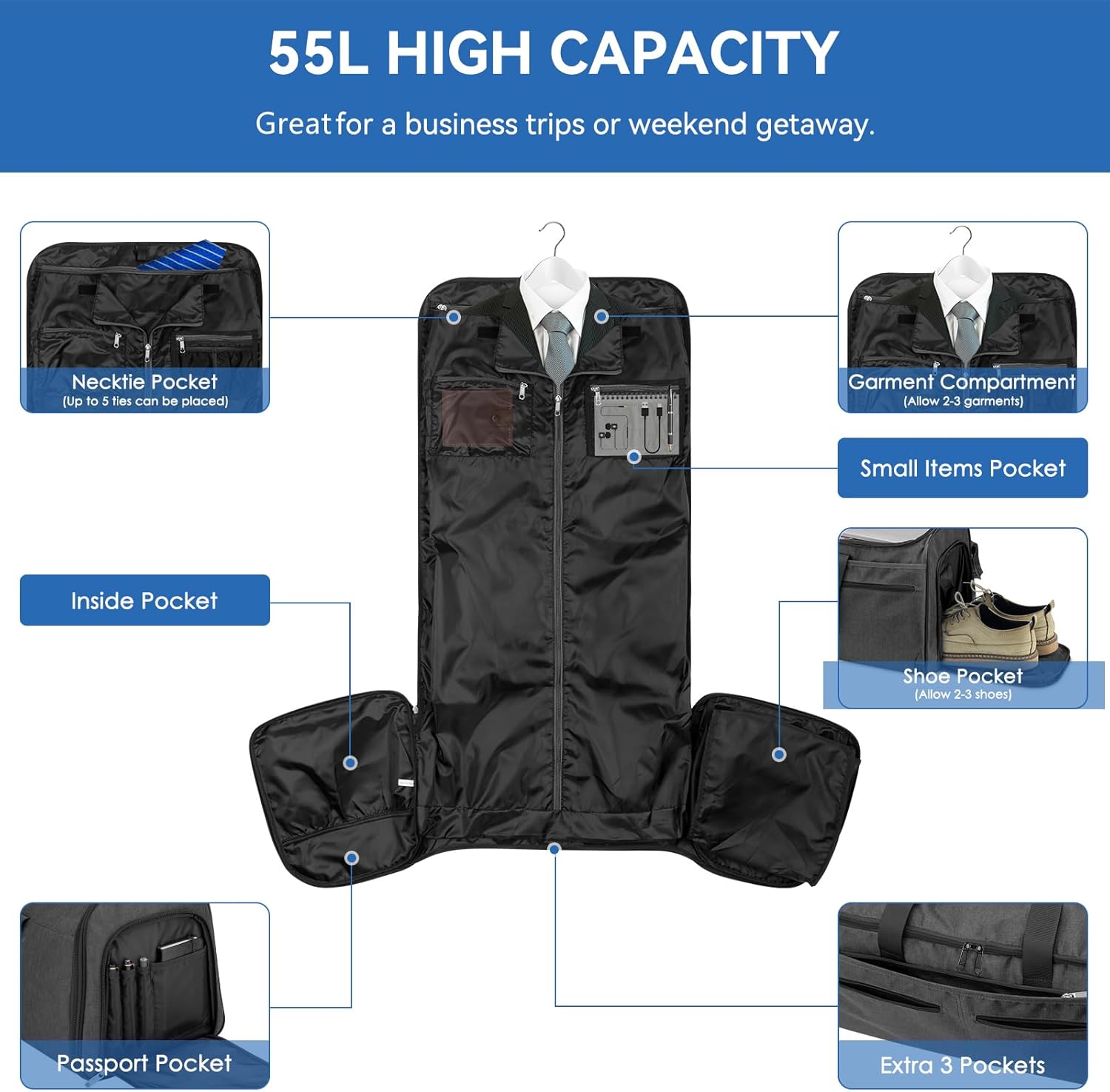 - 3-in-1 Travel Bag: Stay tidy and wrinkle-free on your trips! This bag combines a garment bag, duffle bag, and backpack. Keep your suits and dresses neat with 4 elastic straps, good for business trips or turning into a duffle for vacations. Great for business, parties, vacations, gym, or touring.