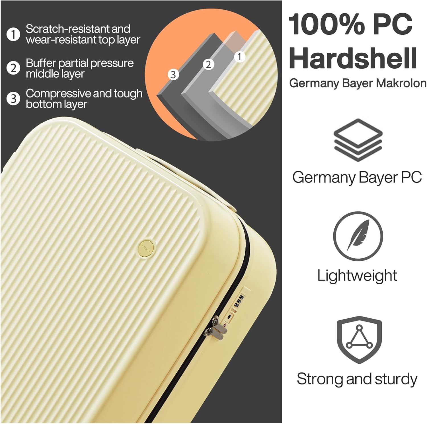 - 【DURABLE&STURDY MATERIAL】German Covestro PC material is called “Soft Steel” which is extremely scratch-resistant, it ensure this travel luggage’s high quality performance which is built to be your trusted companion to travel.