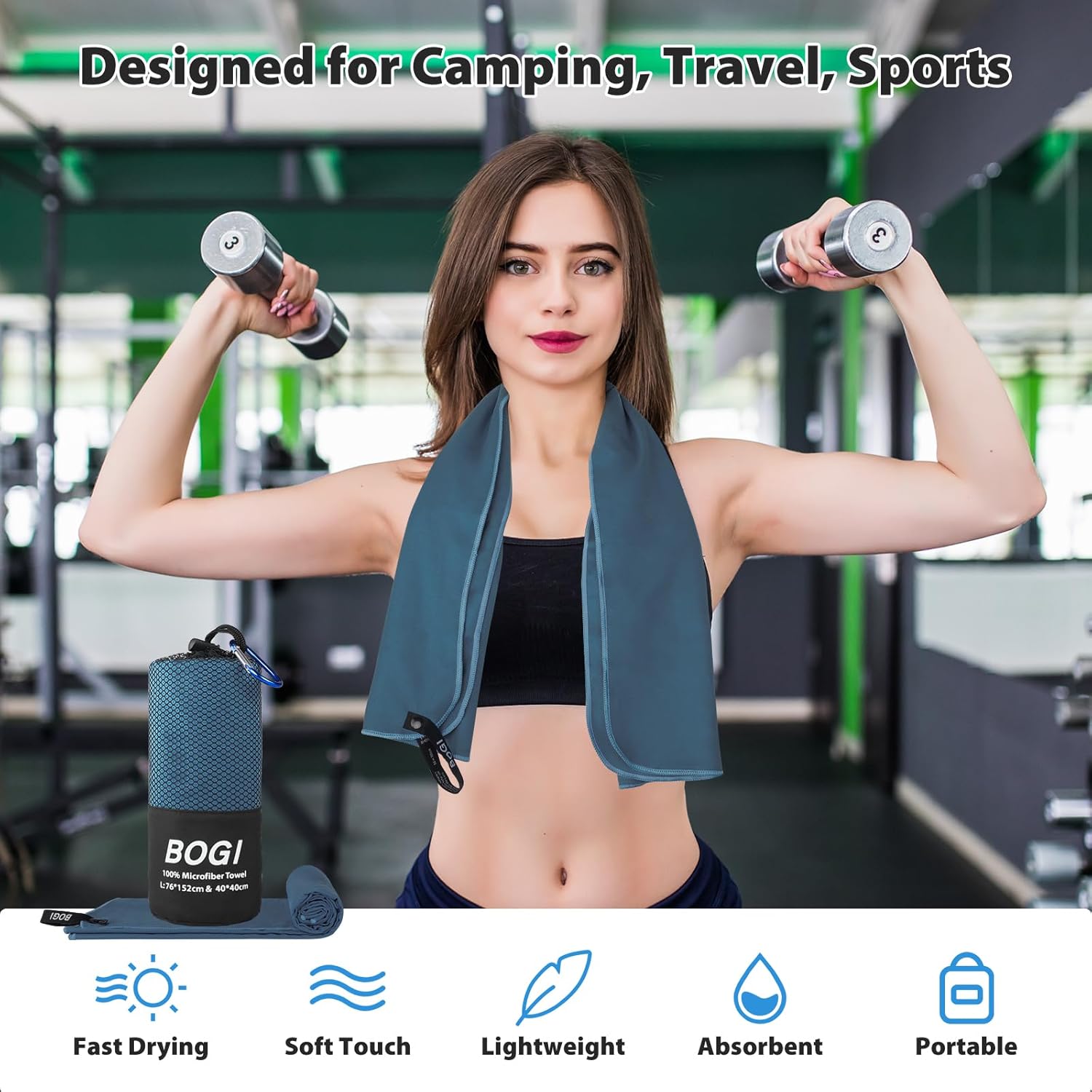 - Bonus a Gift Bag & Carabiner: BOGI towel comes with a breathable gift bag, easy to carry and hanging loop to protect your towel. When you go out or travel, you can put it into the bag. Our microfiber travel towel set is so compact and space saving. The snap loop is great for hanging up. And without worrying about it flying away. Daily lifestyle, less trouble for travel. A love gift for your family, lover and friends. If you have any questions about our towels, please feel free to contact us.