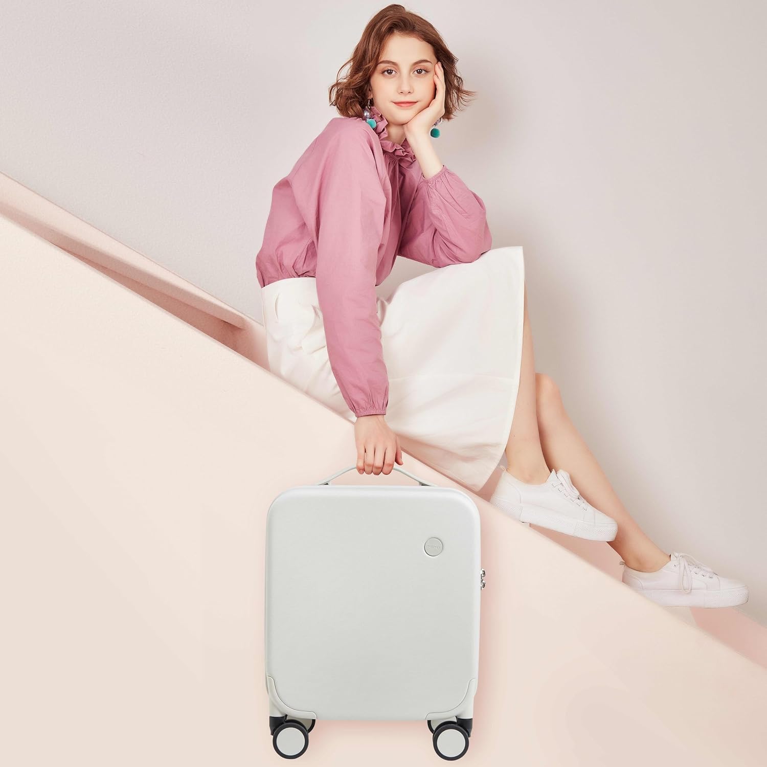 mixi Upgrade Carry on Luggage 14 Inch Underseat Personal Item Suitcases with Spinner Wheels, Hardside Rolling Suitcase PC with TSA Lock Lightweight Travel Case, Fine Grid Smoke White