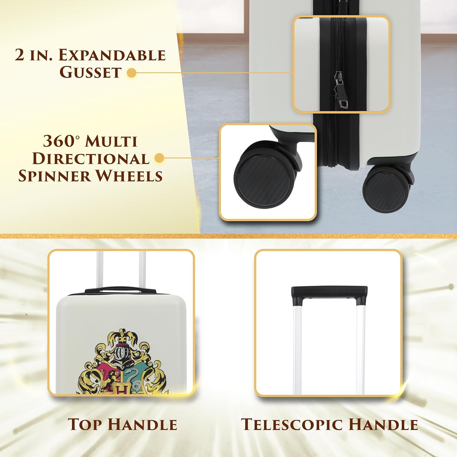 - HARRY POTTER HOGWARTS CREST DESIGN: Travel in wizarding style with this officially licensed Harry Potter small carry-on suitcase featuring all four Hogwarts house crests of Gryffindor, Slytherin, Ravenclaw, and Hufflepuff