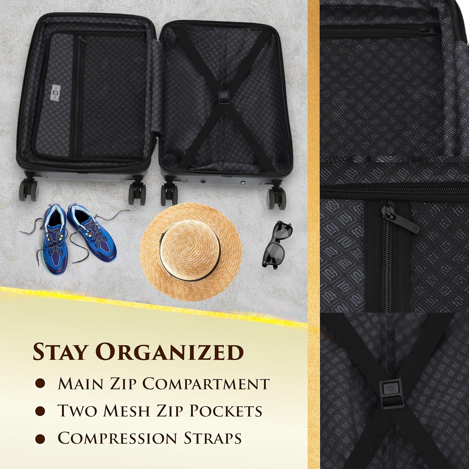 - EXPANDABLE ORGANIZED INTERIOR: Each hardside suitcase features a fully lined polyester interior with divider panel, compression straps, and mesh pocket to store all of your travel essentials; 2 inch expandable gusset adds packing flexibility
