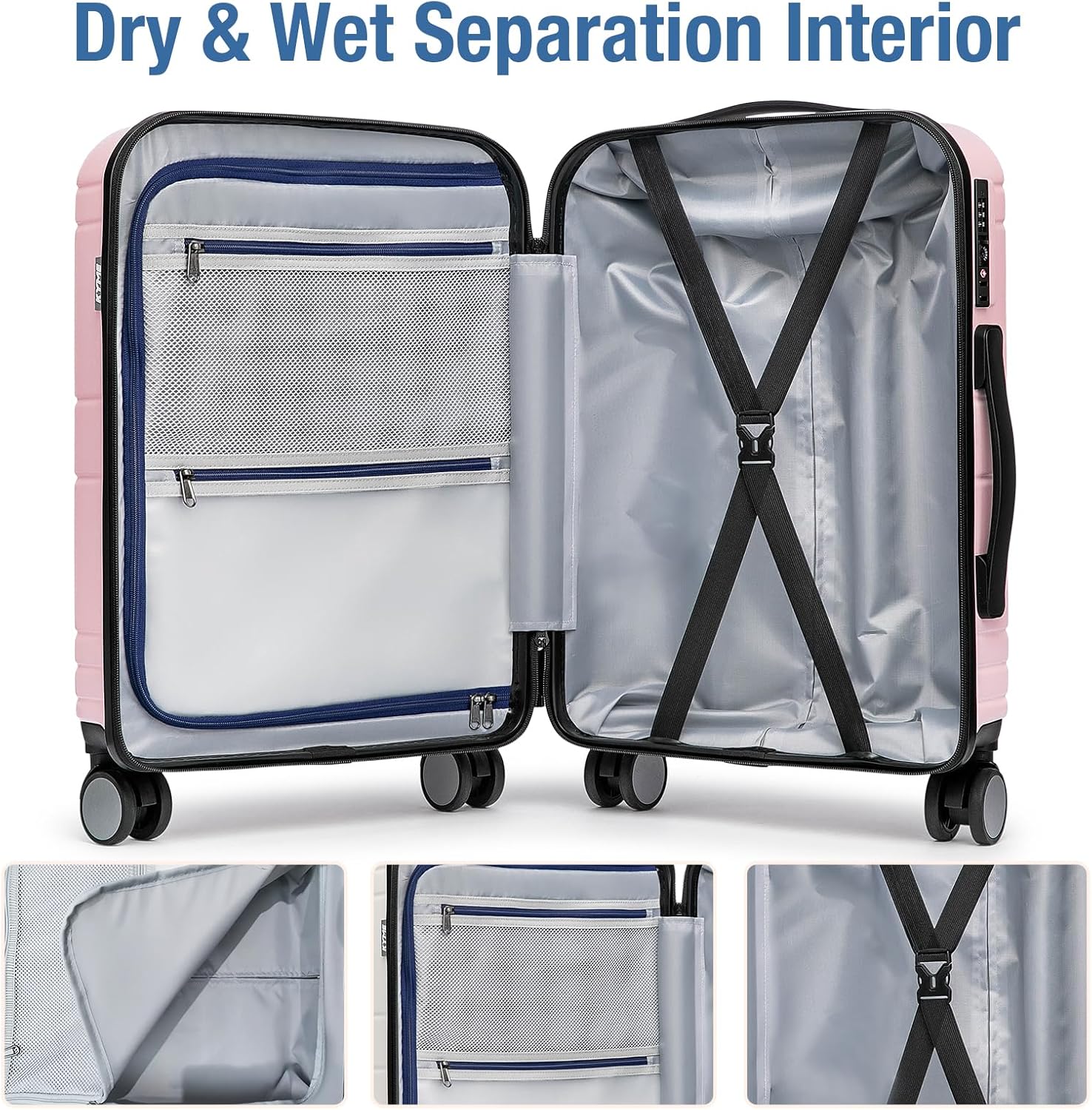 - SPACIOUS INTERIOR: These hardshell expandable 22x14x9 carry-on luggage has multiple storage compartments for easy packing.The main compartment has "X"-shaped cross straps to keep clothes in place. The left side compartment has two zipped mesh pockets for wet and dry storage.Soft silicone handles on the top and sides provide a variety of comfortable carrying options