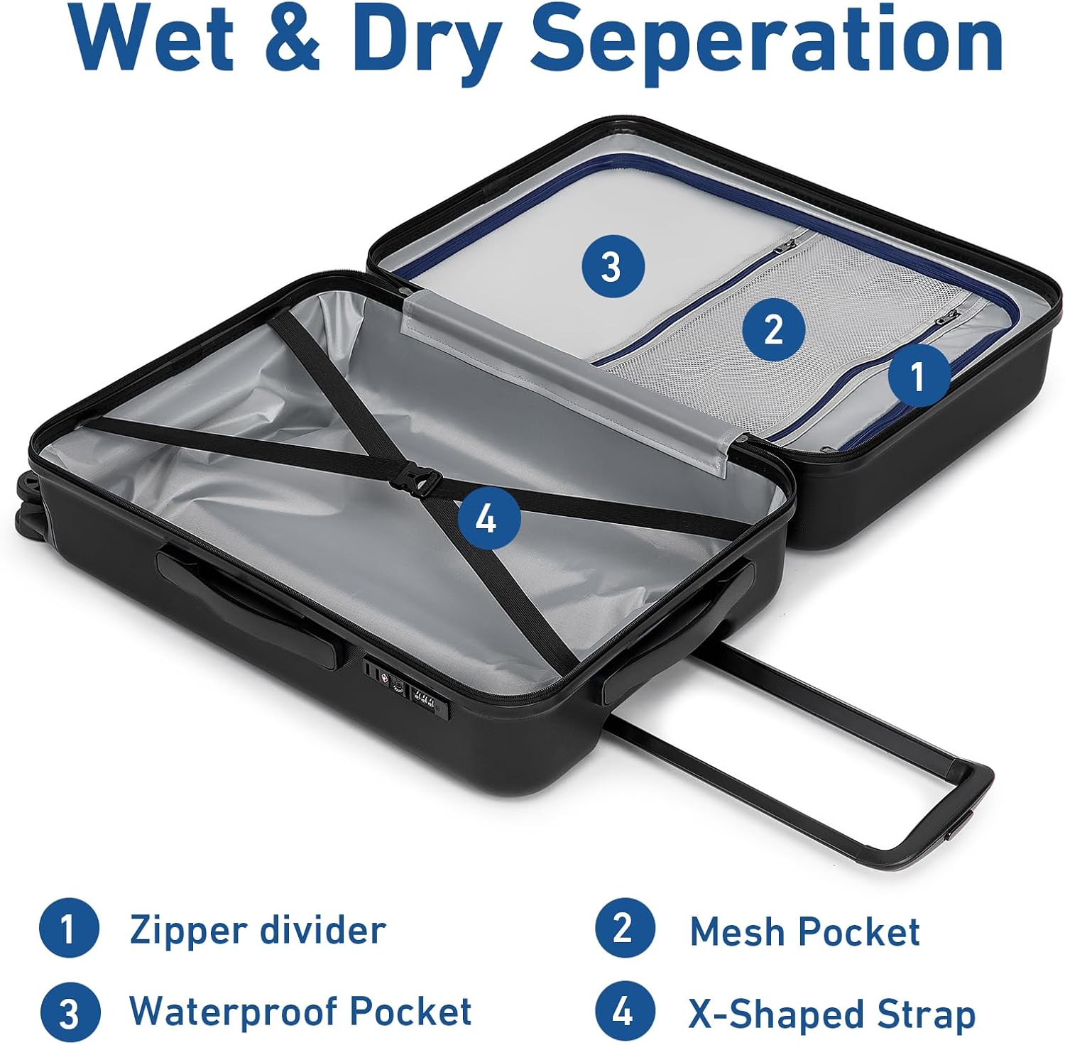 - 2 Pieces Luggage Sets Includes:20" carry on(21.7 x 13.8 x 9.8 inches) and 24" spinner suitcase(26.7 x 16.7 x 10.6 inches).Carry-on luggage suitable for short trips and 24" checked luggage maximize your packing power and the ideal checked bags for longer trips