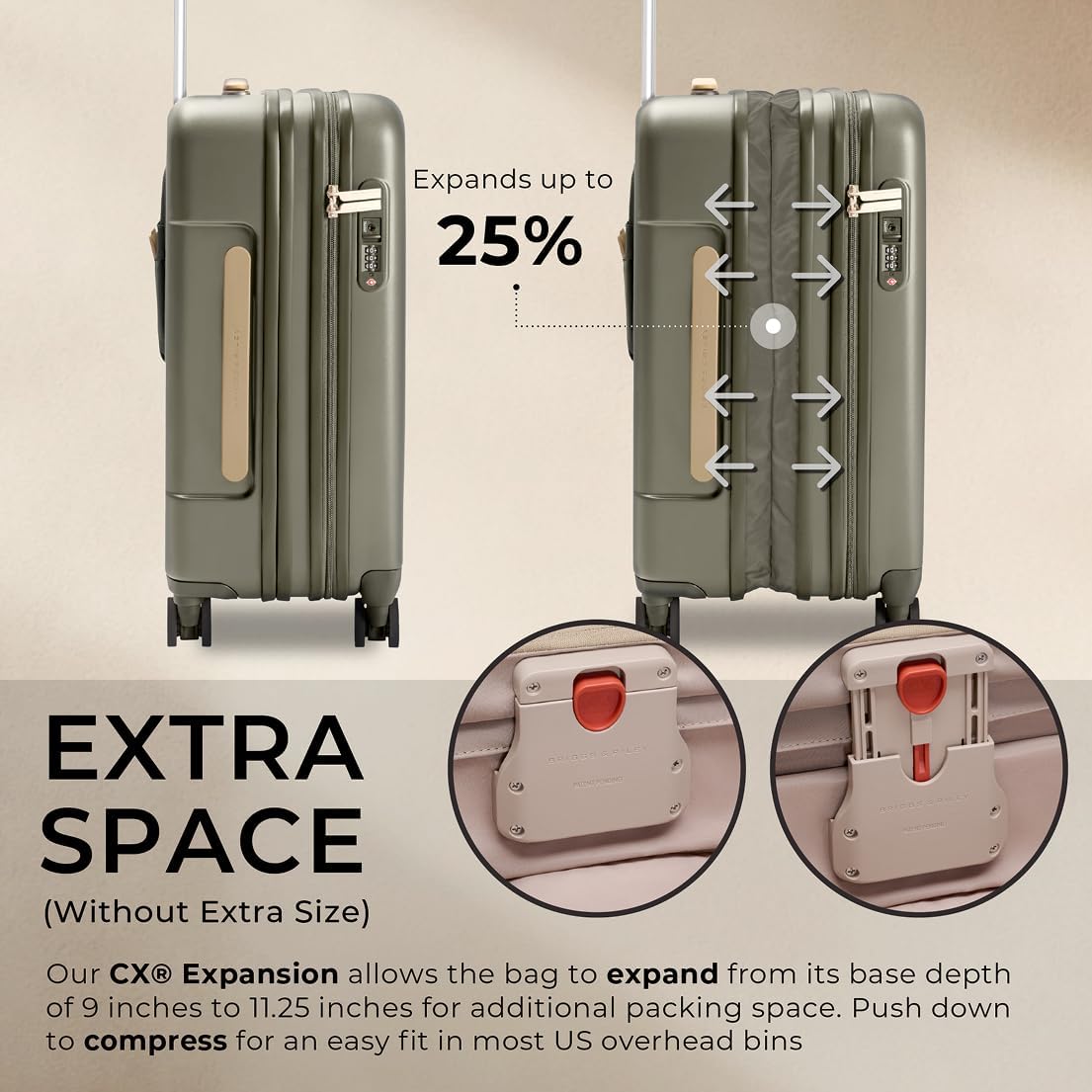 - GLOBAL CARRY-ON LUGGAGE - Measuring 21" x 15" x 9-11.25", this packing system expands by 25% to become astonishingly roomy, then compresses to fit most global airlines' overhead bins
