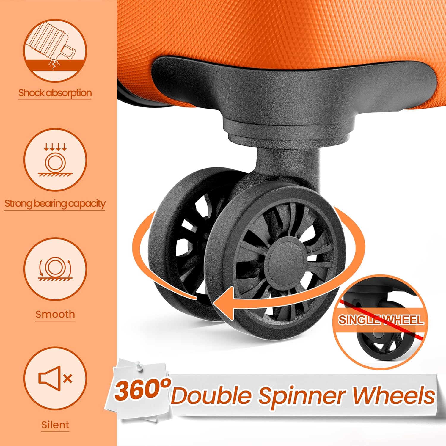 - Dual Spinner Wheel Design: The 4 360° silent dual spinner wheels easily change the direction of move without much effort, moving smoothly through crowded streets, train stations or airports, enhancing your travel experience.