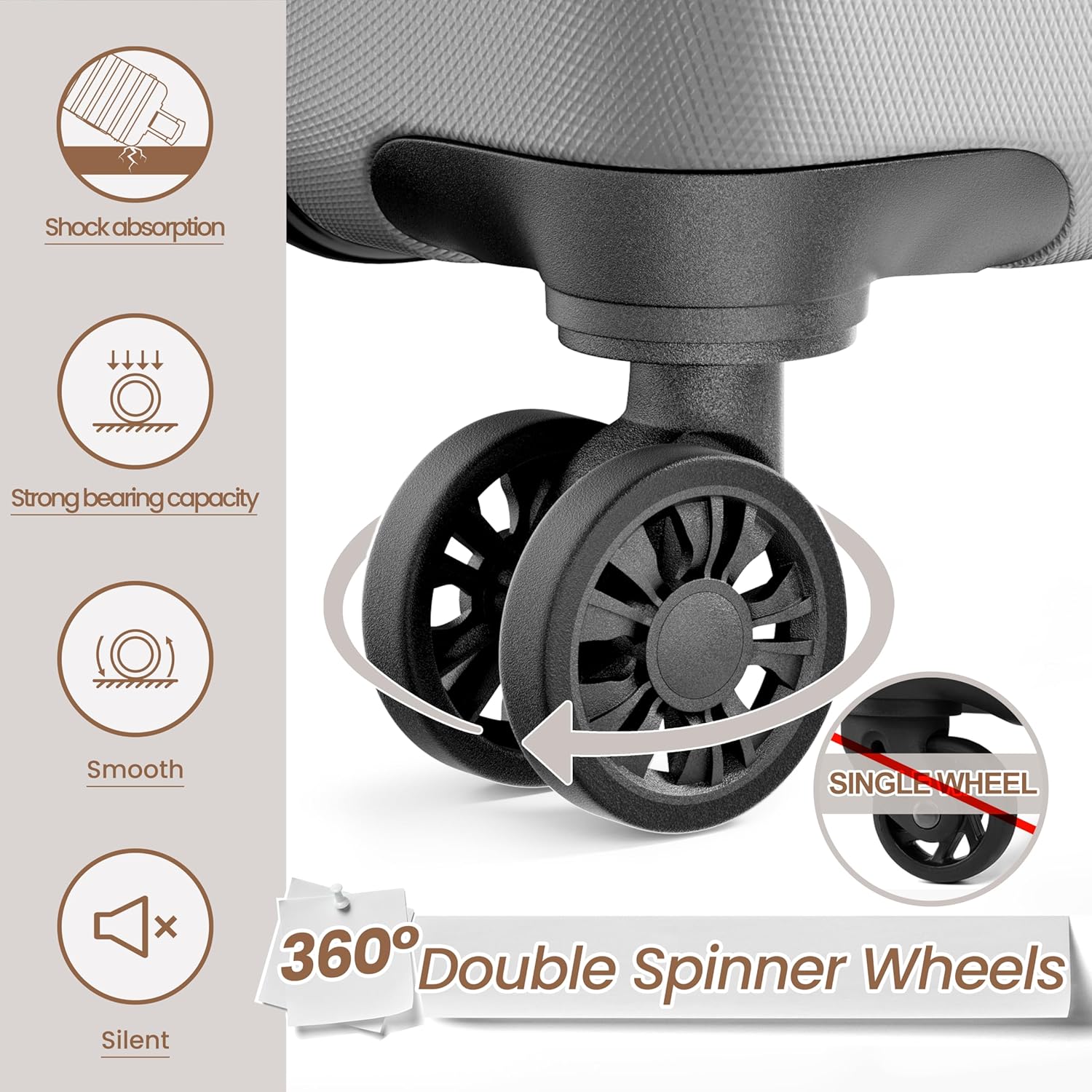 - Dual Spinner Wheel Design: The 4 360° silent dual spinner wheels easily change the direction of move without much effort, moving smoothly through crowded streets, train stations or airports, enhancing your travel experience.
