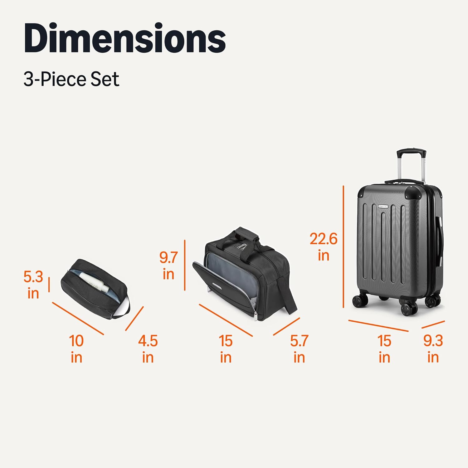- VERSATILE CARRY-ON SET: Includes travel case, tote, and hardside suitcase; travel case measures 10 x 4.5 x 5.3 inches, tote measures 15 x 5.7 x 9.7 inches, suitcase measures 15 x 9.3 x 22.6 inches (all measurements include wheels)