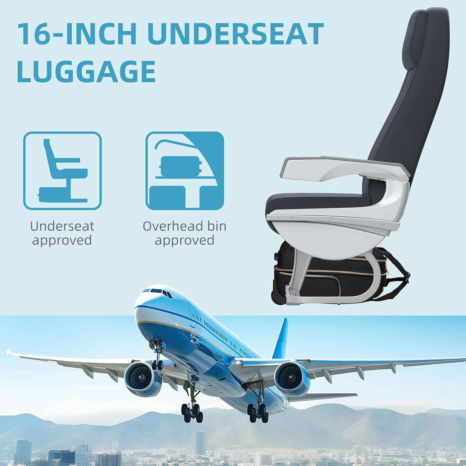 - Airline Approved: 3 piece set includes 16" Underseater luggage, a travel backpack and toiletry bag. The rolling underseat bag meets most airlines' personal item sizes, fitting perfectly under the seat or in the overhead bin with its 15.8x13.4x7.5" dimensions