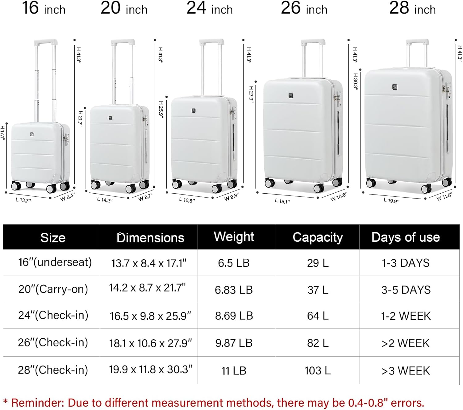 - 【3 Piece Luggage Set contains】20 inch carry on luggage 21.3 x 13.5 x 8.8 inches, Capacity 37L, 24 inch checked luggage 25.9 x 16.5 x 9.8 inches, Capacity 64L, 28 inch luggage 30.1 x 19.7 x 11.4 inches, Capacity 103L. The small suitcase can be stored inside the bigger one.
