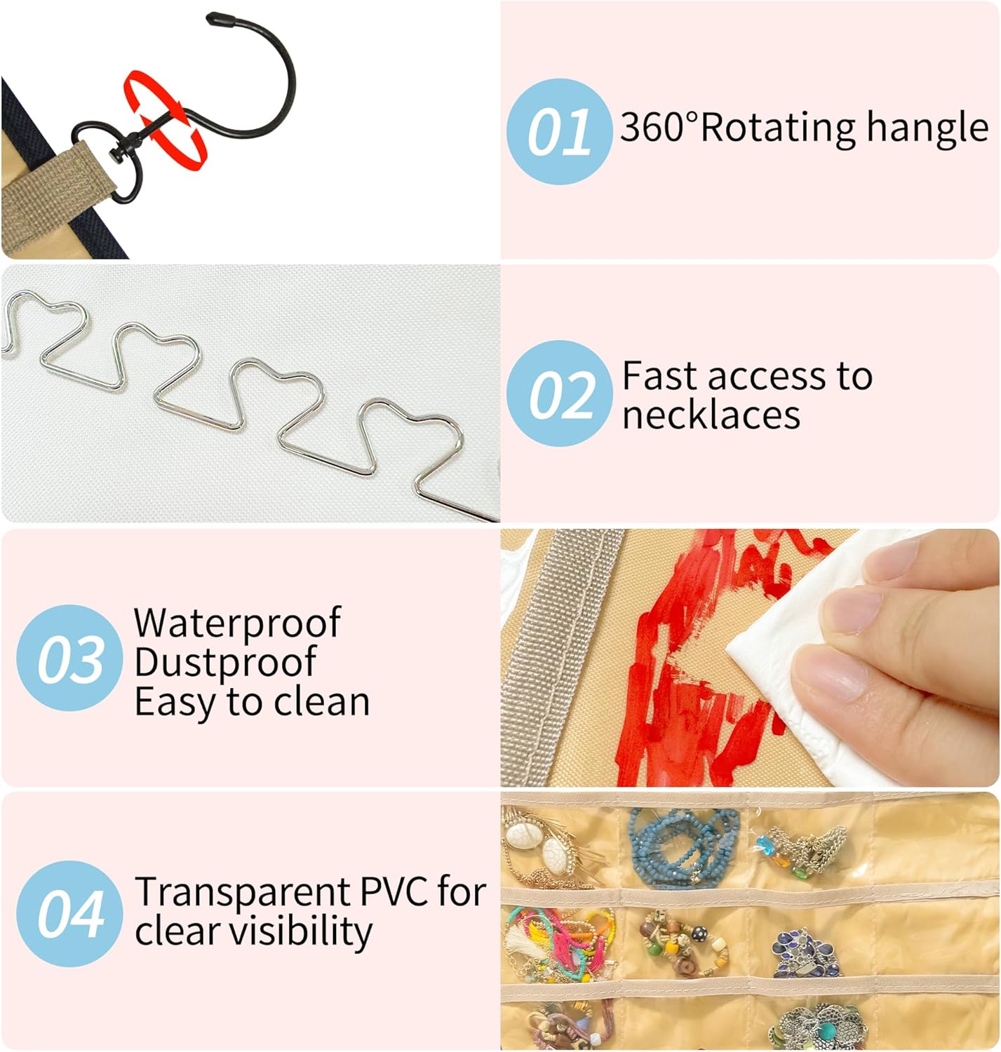 - Perfect for Any Space: Made from durable polyester, PVC, and strong metal hooks, this jewelry organizer is built to last. The two-sided design, paired with a 360-degree rotating hanger, allows it to be hung anywhere—on a closet rod, door, or wall—saving you valuable space while still providing full access to your jewelry. Plus, it’s more compact than a typical clothing item, making it an ideal addition to any wardrobe.