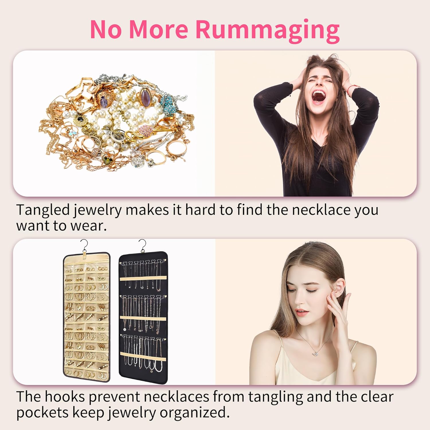 Bloss Hanging Jewelry Organizer-48 Pockets Dual-Sided Hanging Jewelry Organizers and Storage for Necklaces, Earrings Holder on Closet, Wall, Door, Christmas Gifts for Women,Blcak