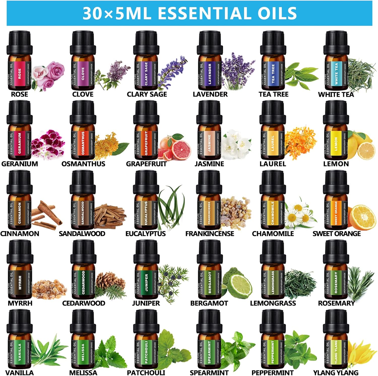 - ❤Multifunctional Essential Oil Diffusers❤ You'll get one 550ml large capacity essential oil diffusers with 30 bottles Natural essential oils, and equipped remote. Our essential oil diffuser can be used as an aromatherapy essential oil diffuser/night light. Uses Ultrasonic technology to atomize, It also includes a convenient auto shutoff feature.