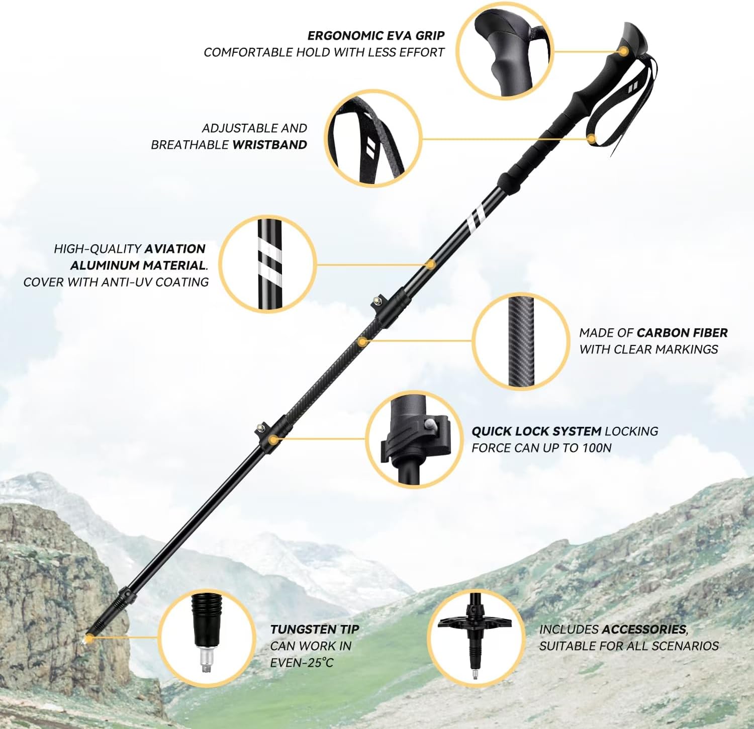 - High Quality - The Collapsible Hiking Sticks Are Made Of Premium Quality Aviation Aluminum and Carbon Fiber, Each Poles Only Weights 10.3 Oz,Which Is Sturdy, Lightweight And Easy To Adjust,assuring maximum strength while maintaining a lightweight profile。 This Trekking Poles are Retractable From 25” to 52”, Fit The Needs of Men, Women And Kids Hiking Trips