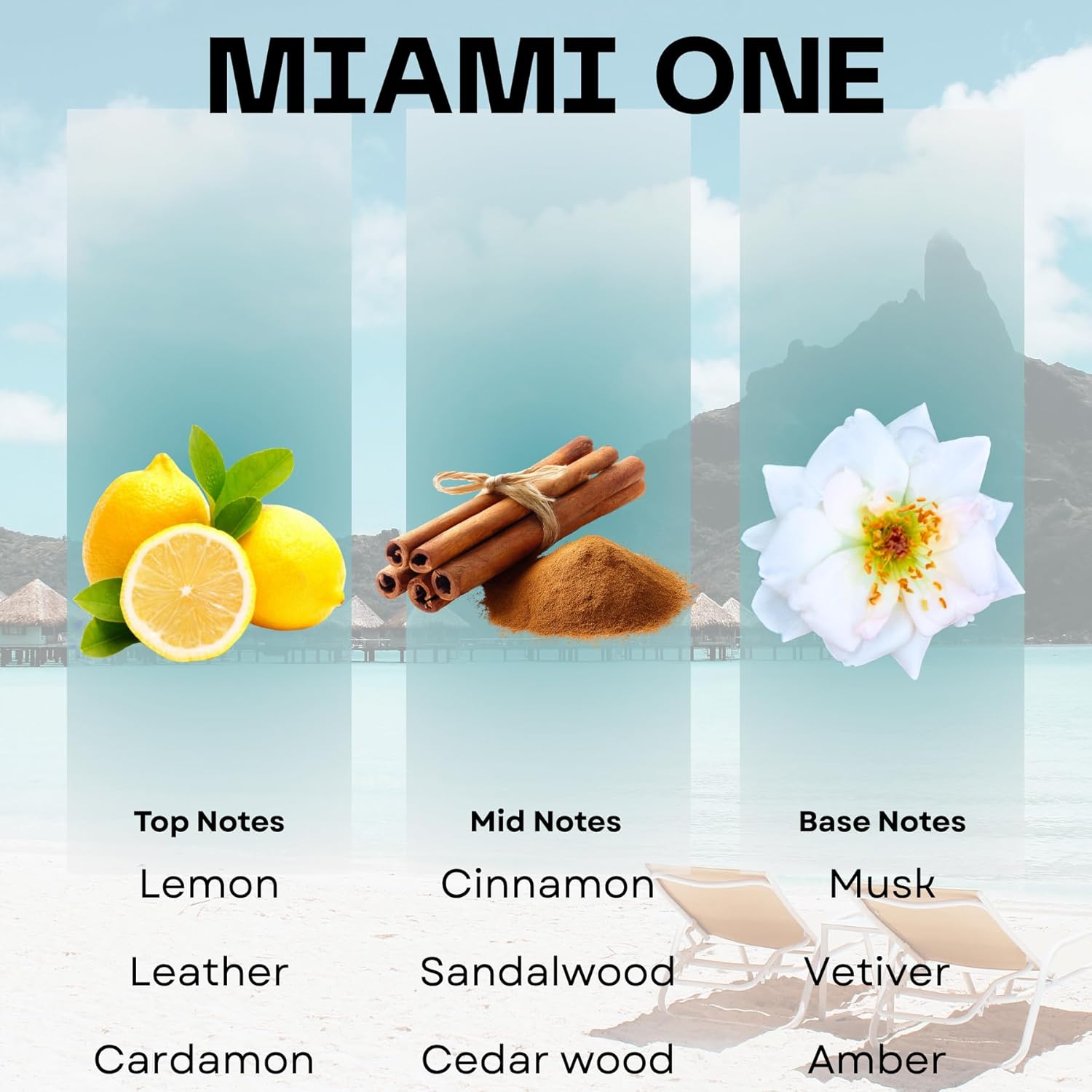 - Aromatherapy Benefits: Featuring sandalwood, cedar, florals, Tuscan leather, amber, cardamom, oud wood, cinnamon, and vetiver, Miami One offers a unique blend of essential oils that harmonize spicy, woody, and citrus notes, creating a captivating and calming atmosphere.