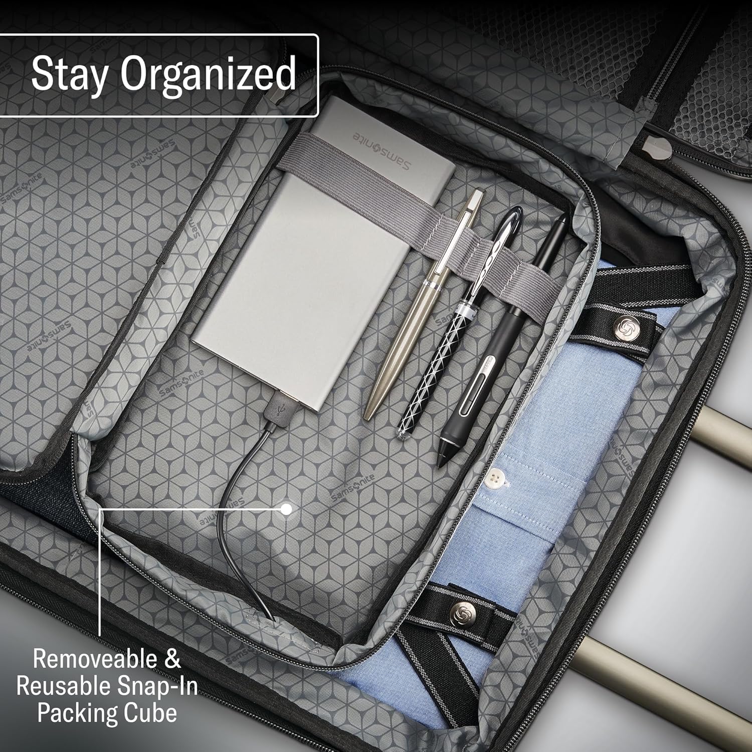 - EXPANDABLE LUGGAGE, BONUS SNAP-IN PACKING CUBE, WETPAK POUCH & ORGANIZATION POCKETS: The spacious interior includes a snap-in packing cube, WetPak pouch for liquids, mesh pockets and compression straps to keep your items organized and securely in place. Expansion zippers all you to increase the packing capacity by up to an additional 1.5 inches.