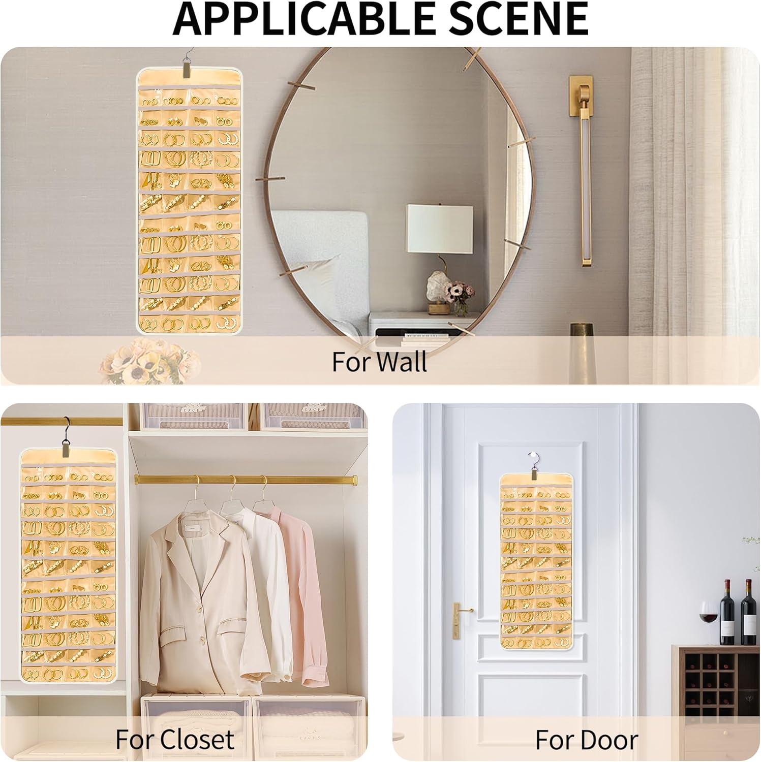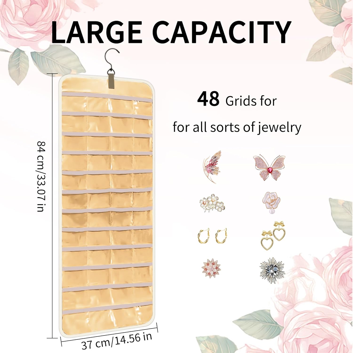 Bloss Hanging Jewelry Organizer with 48 Pockets, Double-Side Hanging Jewelrys Holder with Hanger Hooks, Jewelry Organizers and Accessories Storage for Earrings, Necklaces and Rings,Beige