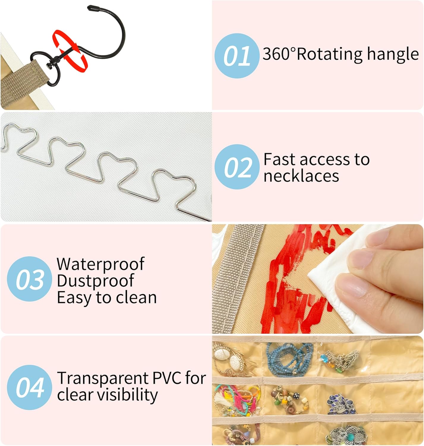 - Thoughtful Design: The organizer features pockets of various sizes, making it versatile enough to hold everything from tiny earrings and rings to larger bracelets, watches, and chains. The transparent PVC material allows you to easily spot your jewelry at a glance without rummaging through a box. This saves time and keeps your jewelry neat and accessible.