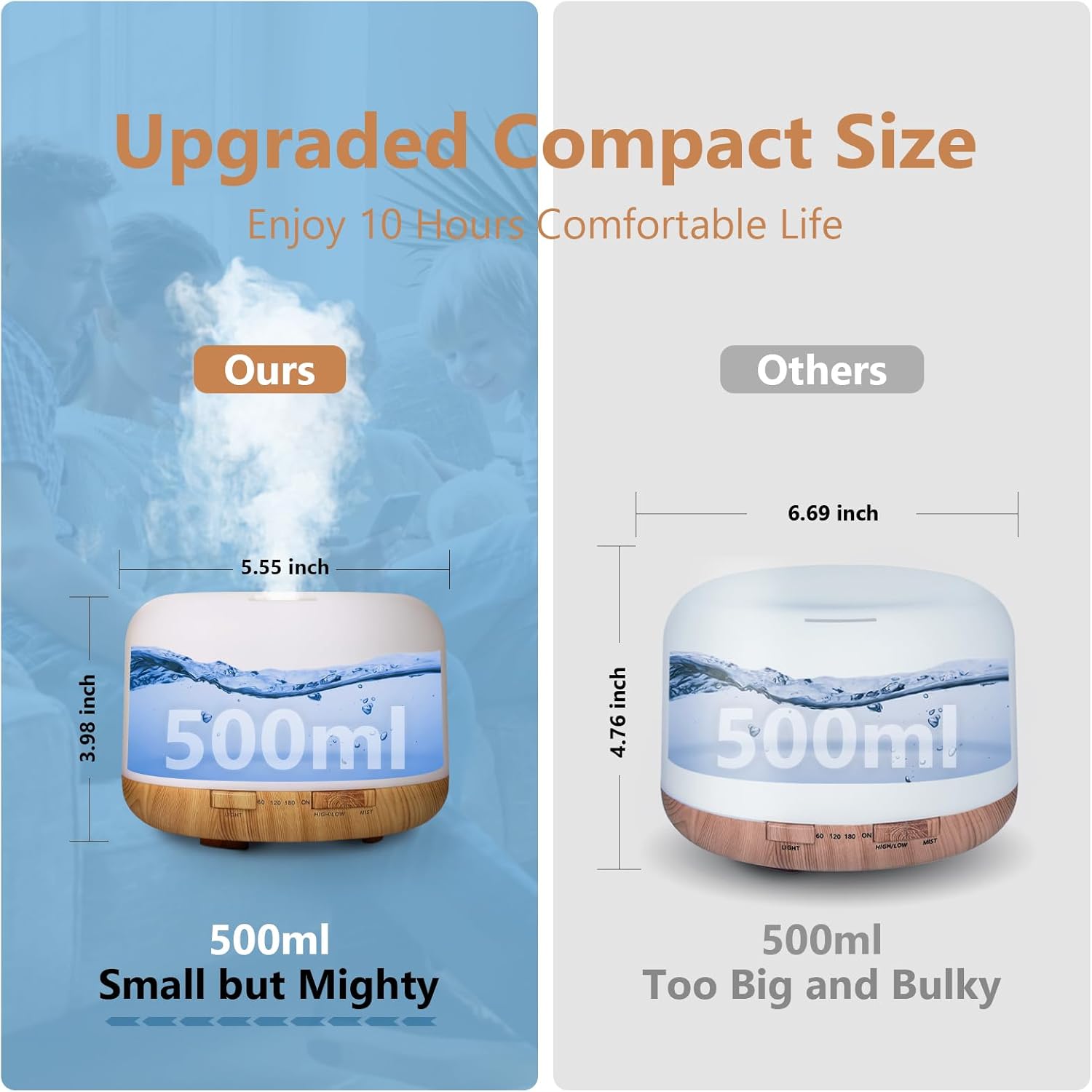 - đăGreatest Giftă Large 500ml water capacity that can continue use up to 7 hours each time. Large tank, Easy to clean, Ultra quiet design, and auto shut-off to protect the device. Multi-functional essential oil humidifier be built for family life. If you have any issue with your diffuser, do not hesitate to contact us - your satisfaction is paramount!