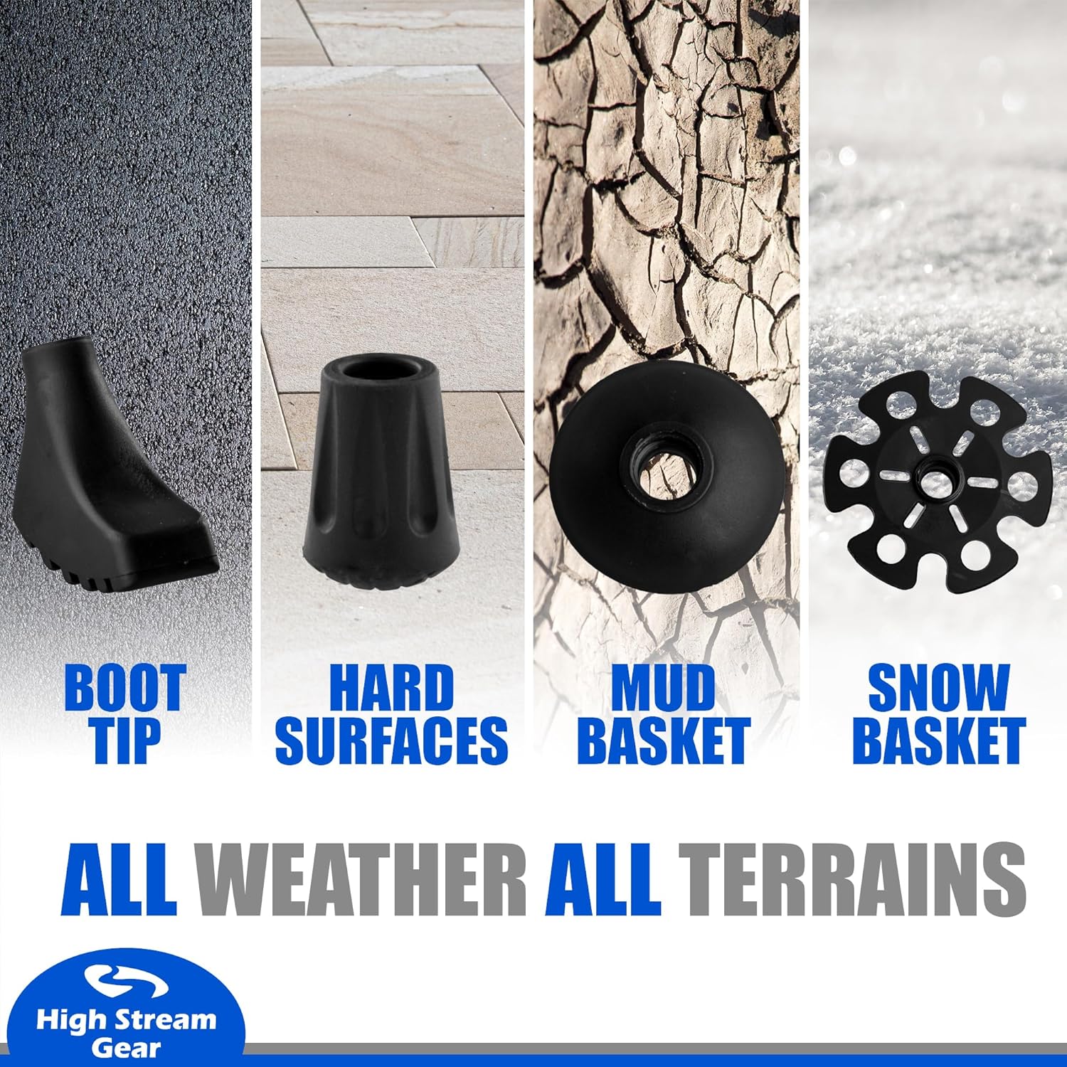 - KEEPS YOUR HANDS BLISTERS FREE - High Stream Gear’s Walking sticks for women and men are made with ergonomically designed handles that offer you a firm but comfortable grip. The handles will keep your hands dry.