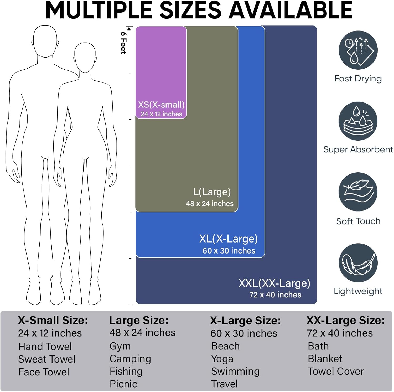 - Versatile: Available in multiple sizes, these workout towels are perfect for bath, sports, yoga, swimming, camping, hiking, or as a beach towel; Their durable, lightweight, and quick-drying design makes them ideal for any adventure or everyday use; Whether at the beach or home exercise, these versatile towels effortlessly meet all your needs