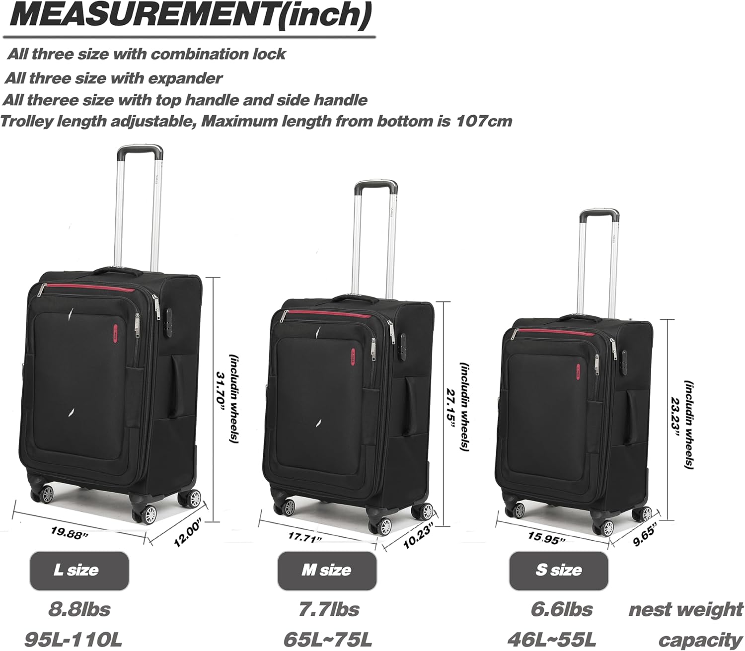 Softside Luggage Sets, Extra Large Expandable Suitcase Sets With Spinner Wheels and Combination Lock Red Luggage For Long Time Overseas Journey(Black) 22inch, 26inch, 30inch