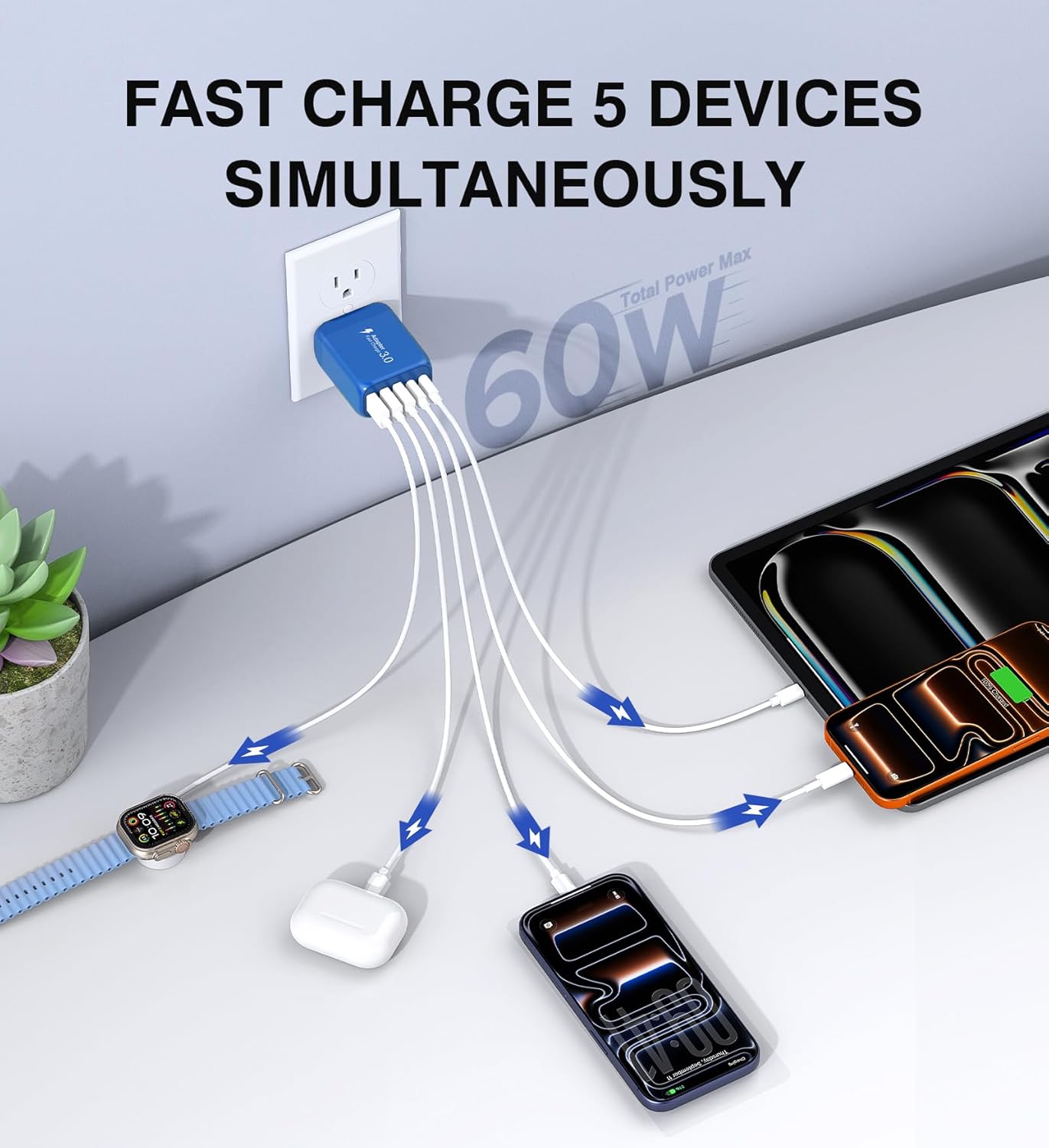 - Compact and Portable USB and USB C Charging Block: The 5-port charging cube boasts an incredibly compact size that enhances portability. All of this power is housed in a pocket-friendly compact body wherever the journey takes you. Perfect for home, office and on the go. We offer this 60W 5-port usb c wall charger (cable not included). If you have any problems with the wall charger fast charging, please contact us