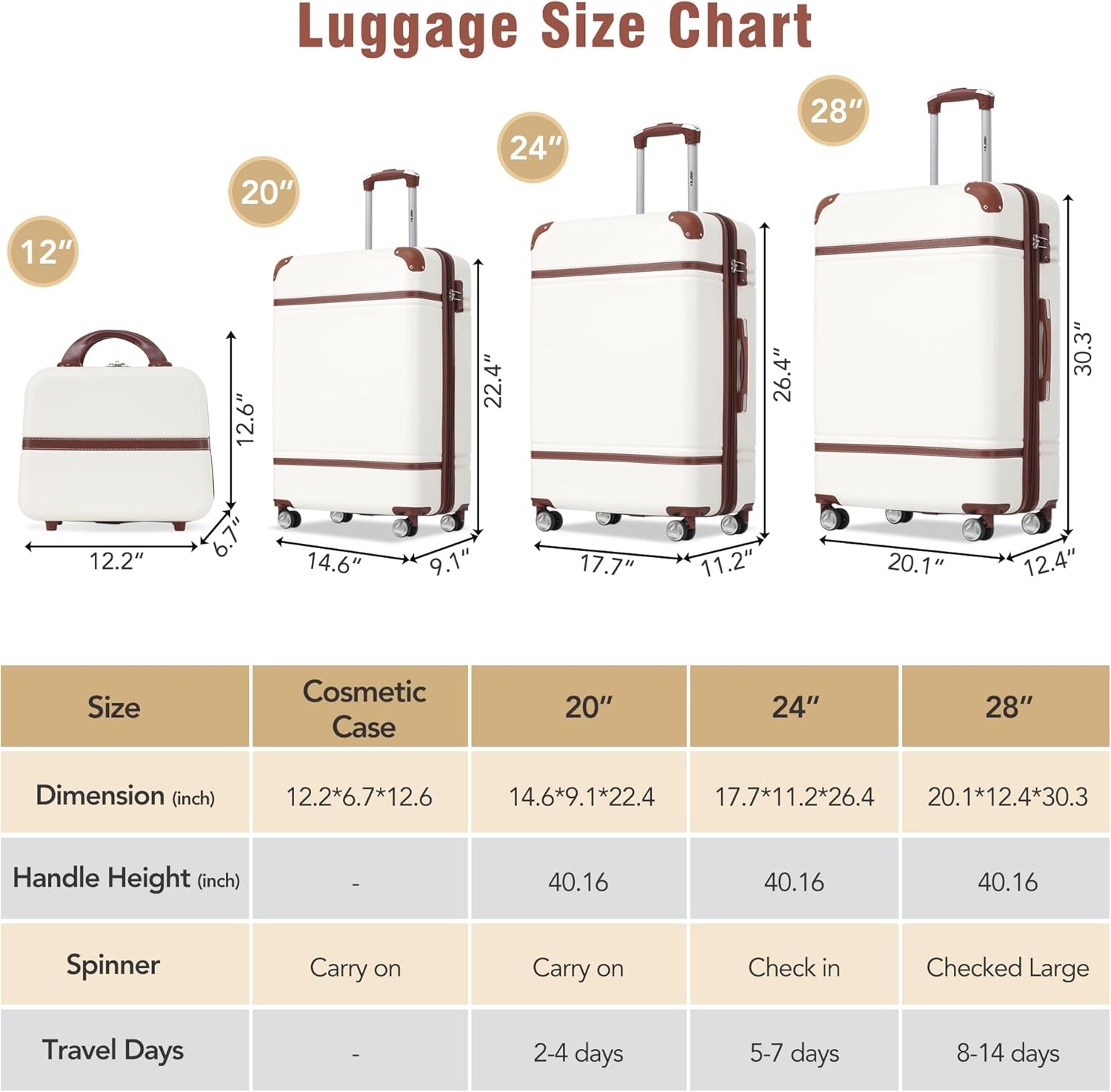Merax Luggage Set 3 Piece Suitcase Set with 1 Cosmetic Case Expandable Spinner Wheels Vintage Luggage Sets(White,20"+24"+28")