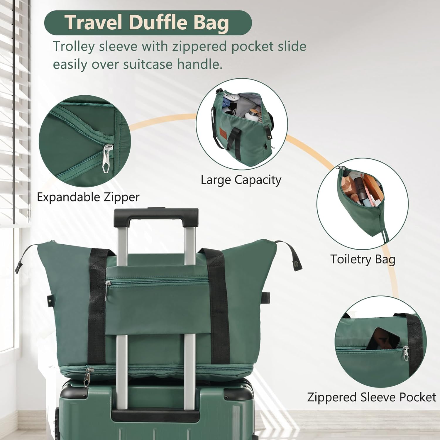 - [Expandable Duffel Bag] longest length: 21.7", shortest length: 15.7", width: 8.3", height: 13", expanded height: 17.7". Travel duffel bag features a trolley sleeve with a zippered pocket that easily slides over the luggage handle. Weekender bag can be expanded to hold more items. Perfect travel bag, gym bag.