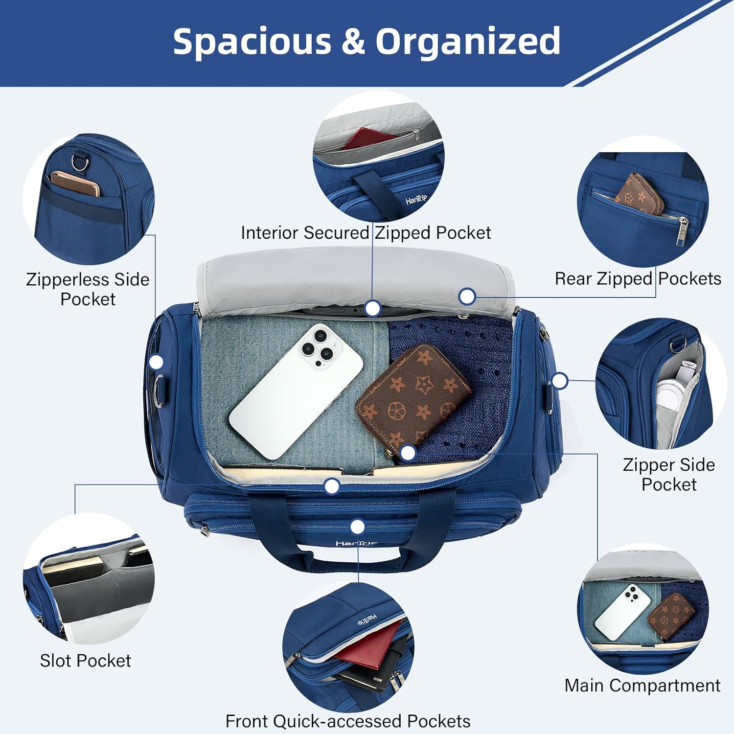 - 【Small Carry on Luggage Bag of Large Capacity】Carry on duffel bag boasts 24.5L intelligently partitioned space for ultimate organization. Main compartment includes card slots and a zippered security pocket for valuables, while exterior quick-access front pockets hold essentials like passports or phones. Additional side pockets and anti-theft rear pocket secure small items. Perfect as weekender bags for women or mens travel bag, it accommodates personal items like clothing, electronics, etc.