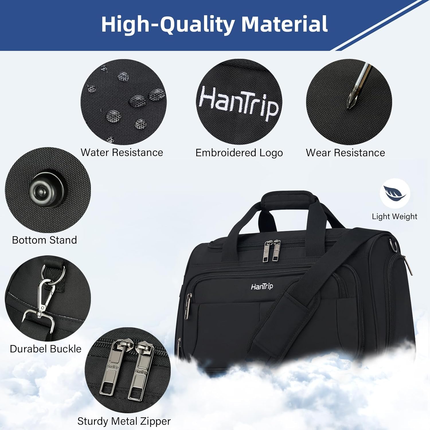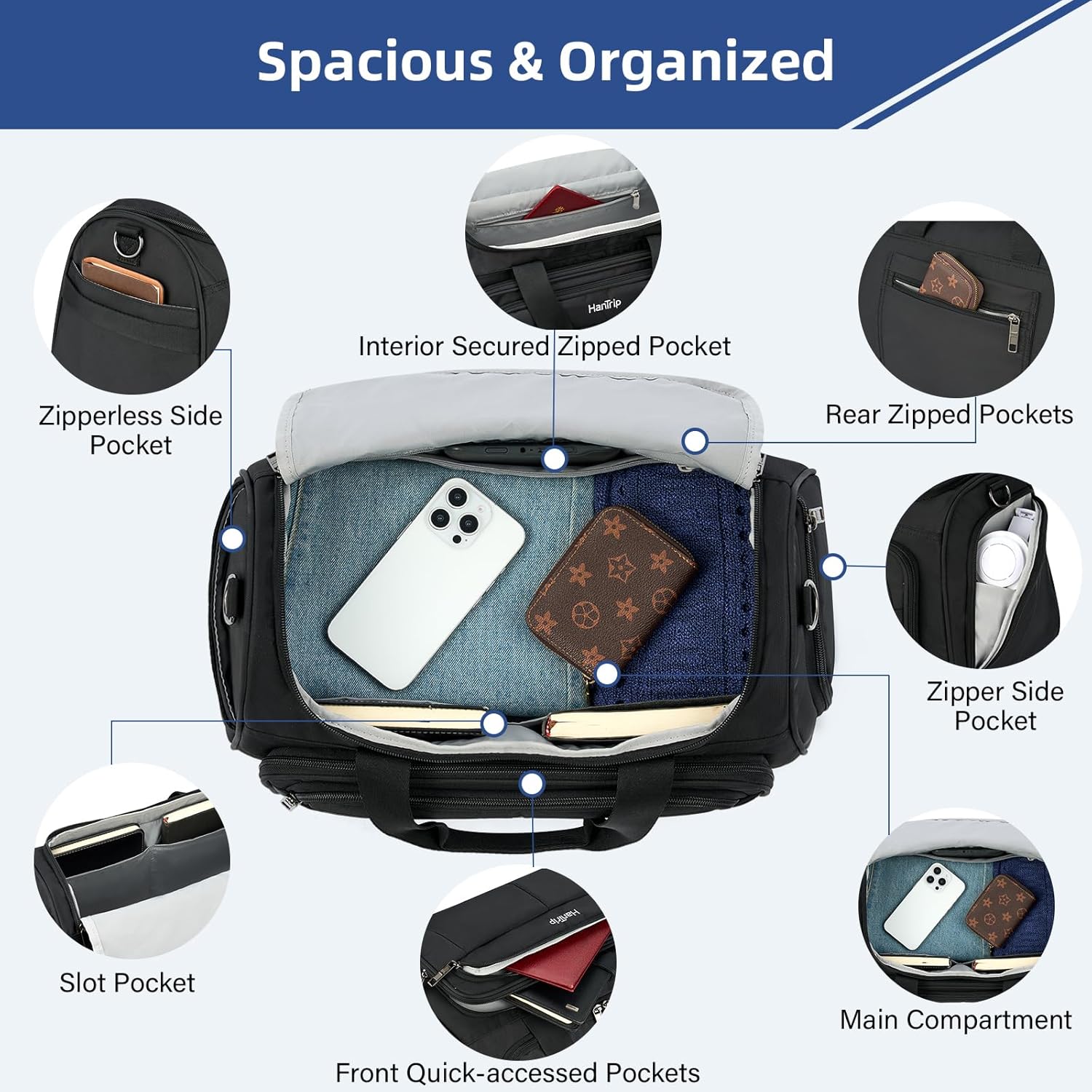 - 【Small Carry on Luggage Bag of Large Capacity】Carry on duffel bag boasts 24.5L intelligently partitioned space for ultimate organization. Main compartment includes card slots and a zippered security pocket for valuables, while exterior quick-access front pockets hold essentials like passports or phones. Additional side pockets and anti-theft rear pocket secure small items. Perfect as weekender bags for women or mens travel bag, it accommodates personal items like clothing, electronics, etc.