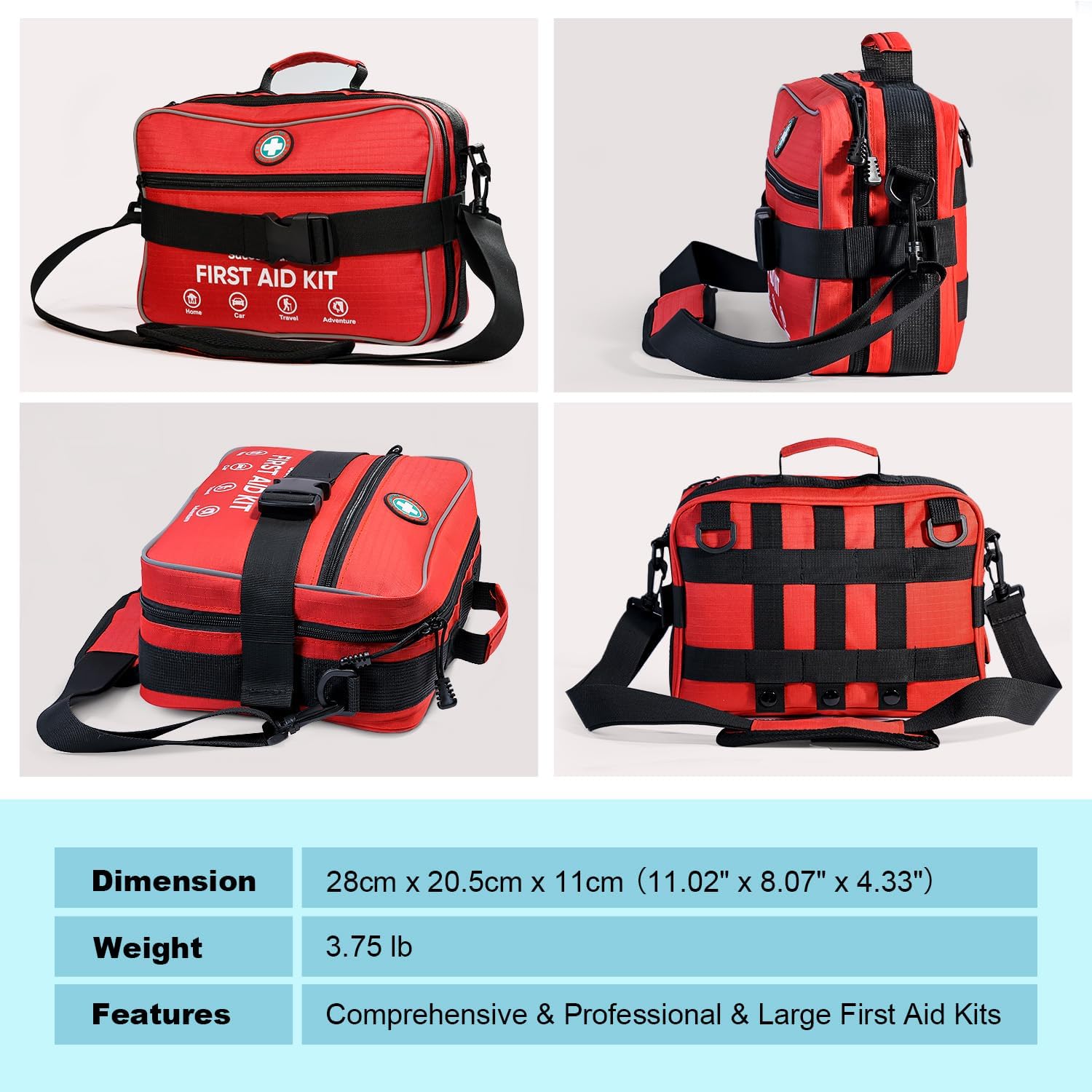 - PORTABLE - First aid kits are equipped with the MOLLE system and are compatible with shoulder straps, carabiners and more. Using the shoulder strap frees up your hands for more flexibility when dealing with wounds.The First aid kit travel has carrying handles on the top and sides for easy attachment to luggage, car or truck, making it easy to carry to a variety of outdoor activities.
