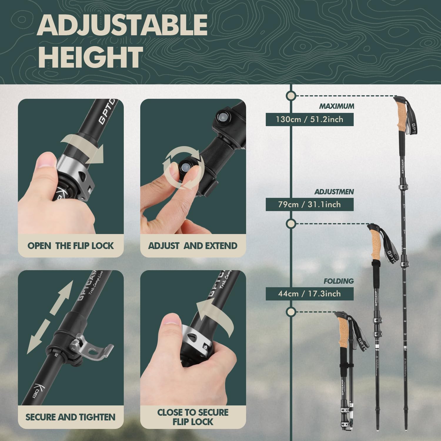 - 【Easy To Fold】:With a folded size of 17.3'', the collapsible hiking poles are compact and easy to carry, making them ideal for hikers, backpackers, and adventurers to ensure you're always ready for your next trip.