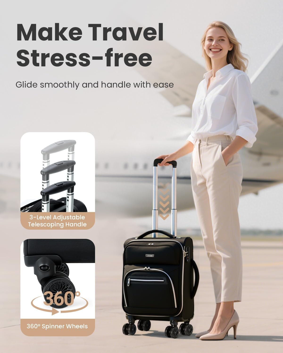 - 【Smart Storage Organization】 The carry-on features a spacious main compartment with a compression system to keep items organized. Includes a zippered pocket for small essentials, plus three large exterior pockets and one side pocket for easy access to personal items.