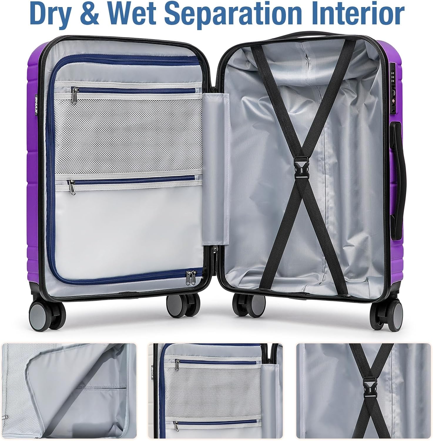 - SPACIOUS INTERIOR: These hardshell expandable 22x14x9 carry-on luggage has multiple storage compartments for easy packing.The main compartment has "X"-shaped cross straps to keep clothes in place. The left side compartment has two zipped mesh pockets for wet and dry storage.Soft silicone handles on the top and sides provide a variety of comfortable carrying options