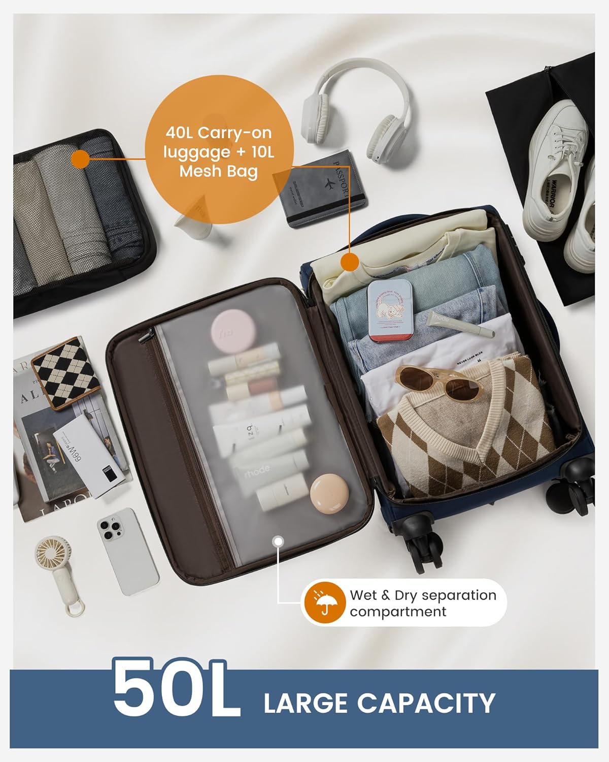 • SMART PACKING FEATURES: This carry on luggage includes 2 bonus storage bags (one shoe bag and one 10L clothes pouch) and a wet compartment for damp items. It keeps your packing neat, organized, and protected for both short and long trip.