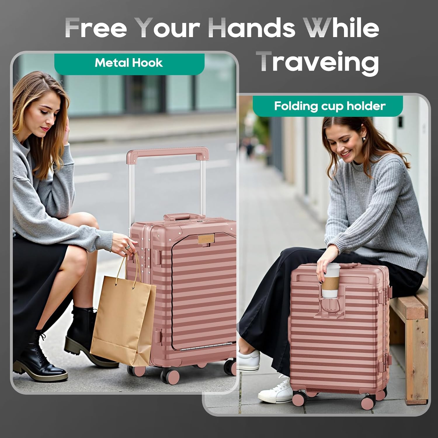 Joyway 20 Inch Carry on Luggage with Aluminium Frame and Front Pocket, PC Hardshell Suitcase with USB Port and Cup Holder, 21.5x14.2x9 Airline Approved, Luggage with Spinner Wheel TSA Lock(Rose Gold)