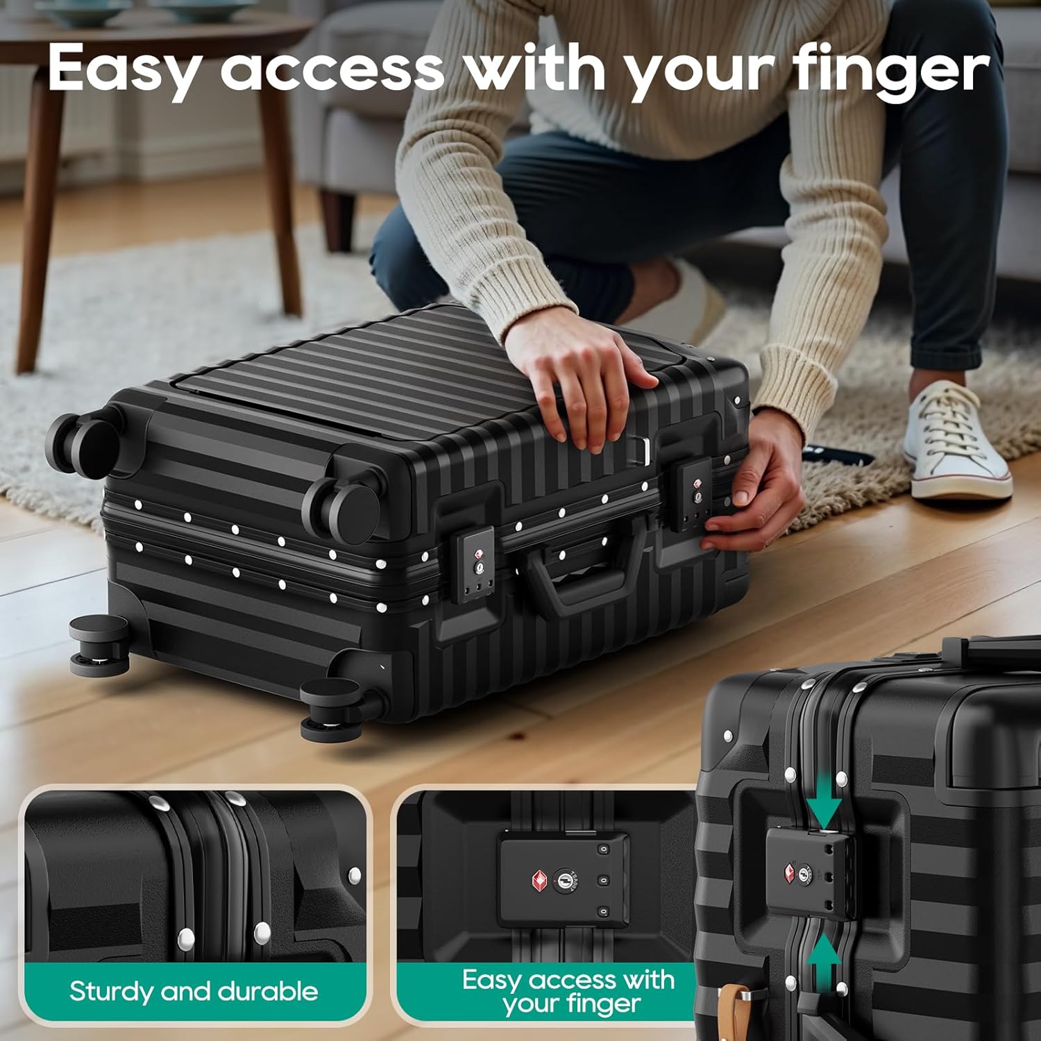 Joyway 20 Inch Carry on Luggage with Aluminium Frame and Front Pocket, PC Hardshell Suitcase with USB Port and Cup Holder, 21.5x14.2x9 Airline Approved, Luggage with Spinner Wheels and TSA Lock(Black)
