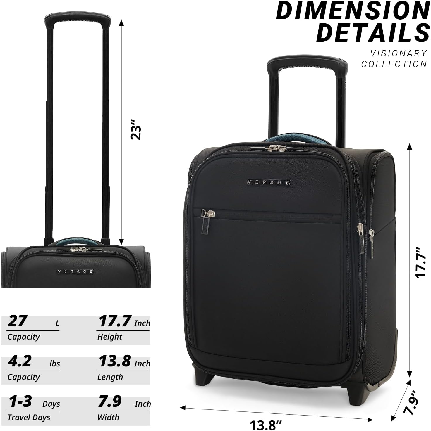 - VERAGE Underseat Carry On Luggage:This softside small suitcase boasts a compact design that easily fits under most airplane seats, making it convenient for on-the-go travelers. Equipped with smooth spinner wheels, this wheeled rolling bag effortlessly glides through busy airports and narrow aisles