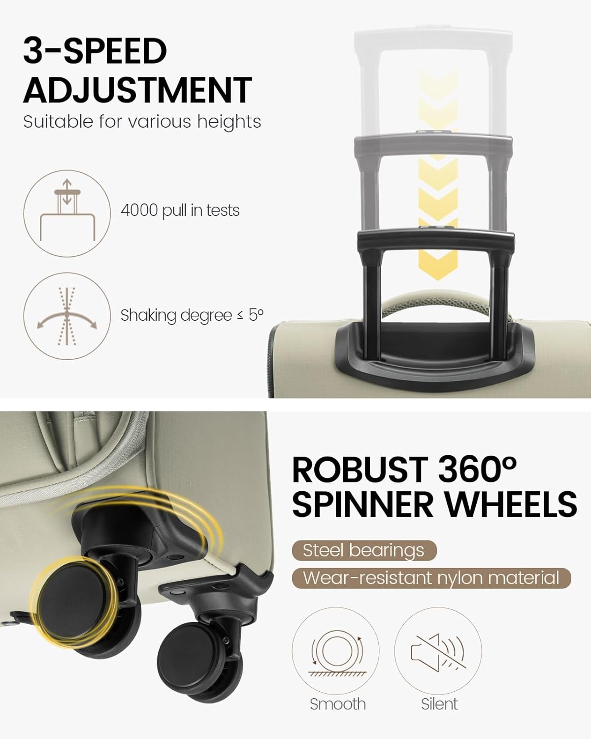 - 【Durable & Smooth-Silent Mobility】Made from premium water- and scratch-resistant polyester, this soft carry-on luggage withstands travel rigors. Its 360° silent spinner wheels feature a precision shaft and thickened design for wear resistance, quiet operation, and superior load capacity.