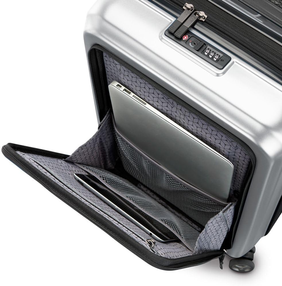 - OCTIV PRO CARRY-ON WITH FRONT POCKET & IMPACT RESISTANT EXTERIOR – Aluminum Silver: Designed for convenience & durability, the Octiv Carry-On Pro features a built-in, easy-access front pocket and a protective hardside polycarbonate base. The padded fabric front pocket includes a dedicated protective sleeve for a laptop or tablet (up to 16in) & organized compartments for your essentials. Sized to fit most overhead bins, the expandable carry-on holds 3-7 outfits – perfect for a short trip or long weekend.
