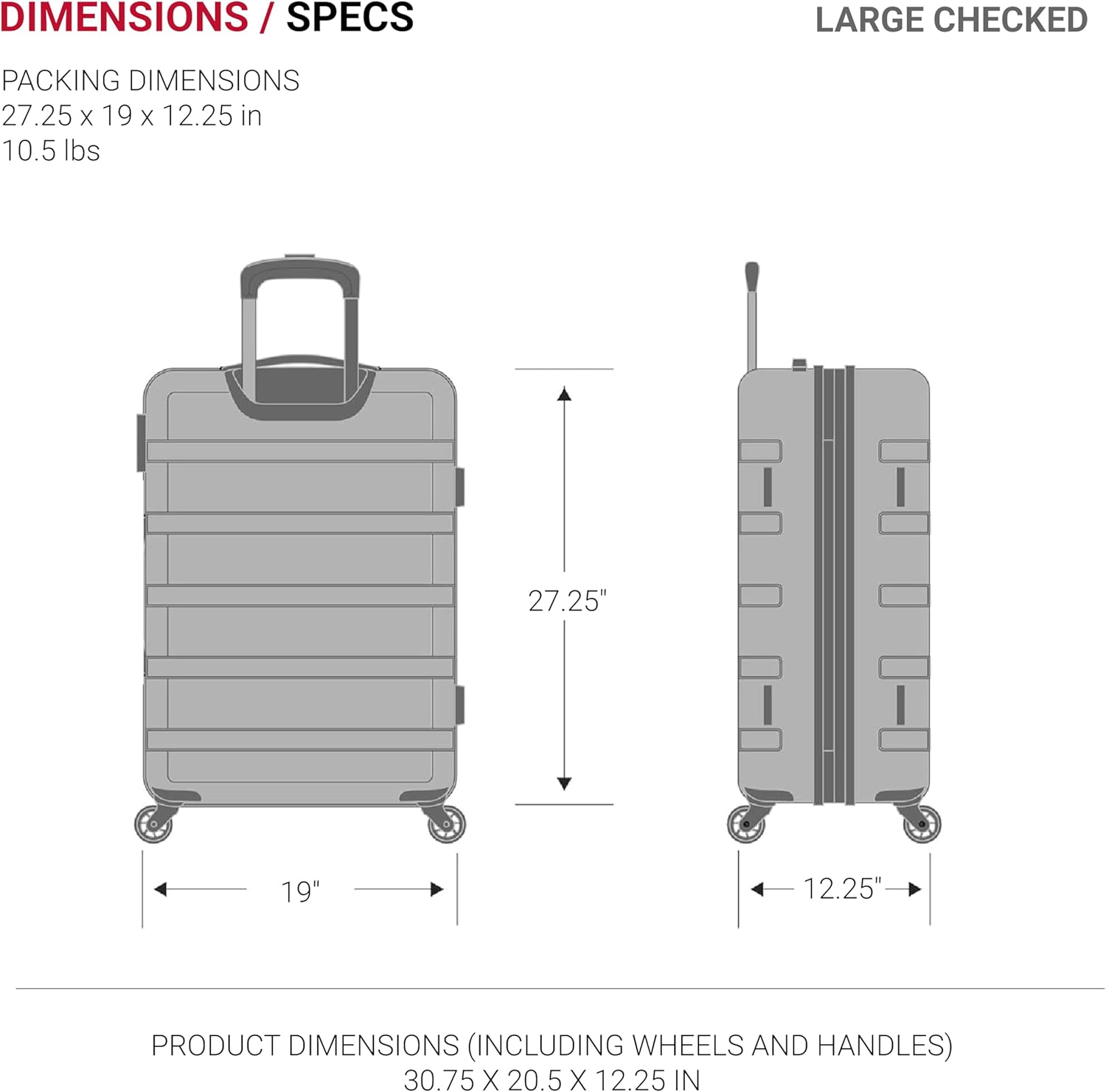 - Expandable Checked Luggage: Offering 27.25" x 19" x 12.25" of packing space, this rolling suitcase is perfect for longer trips. With an overall size of 30.75" x 20.5" x 12.25", it provides ample room for all your travel essentials while keeping everything organized and secure.