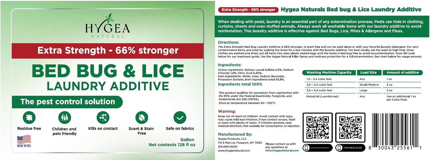 Hygea Natural Extra Strength Lice & Bed Bug Laundry Additive - Gentle, Odorless, and Stain-Free Liquid Laundry Treatment - Child and Pet Friendly - Laundry at Any Water Temperature (1 Gallon)