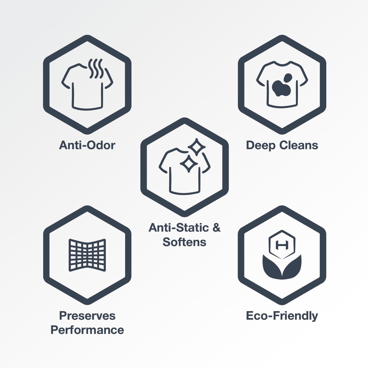 - POWERFUL LIQUID FORMULA: Traditional laundry soap leaves leftover residue behind that corrode and clog your high-performance gear leaving them smelly and reducing their wickability. HEX Performance liquid active wear laundry detergent penetrates today’s ultra tight-knit performance fabrics, like your favorite yoga tops, leggings, sport bras, or compression shorts.