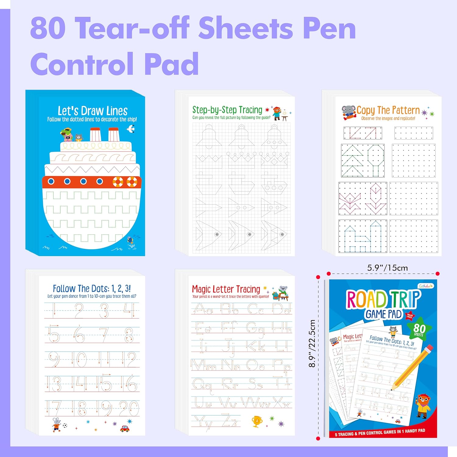 Pen Control & Tracing Activity Pad, 80 Tear-off Sheets Alphabet & Number Handwriting Practice Notepad for Kids, Letters A-Z/Numbers1-20/Patterns Tracing Workbook for Plane, Car Travel, Road Trip