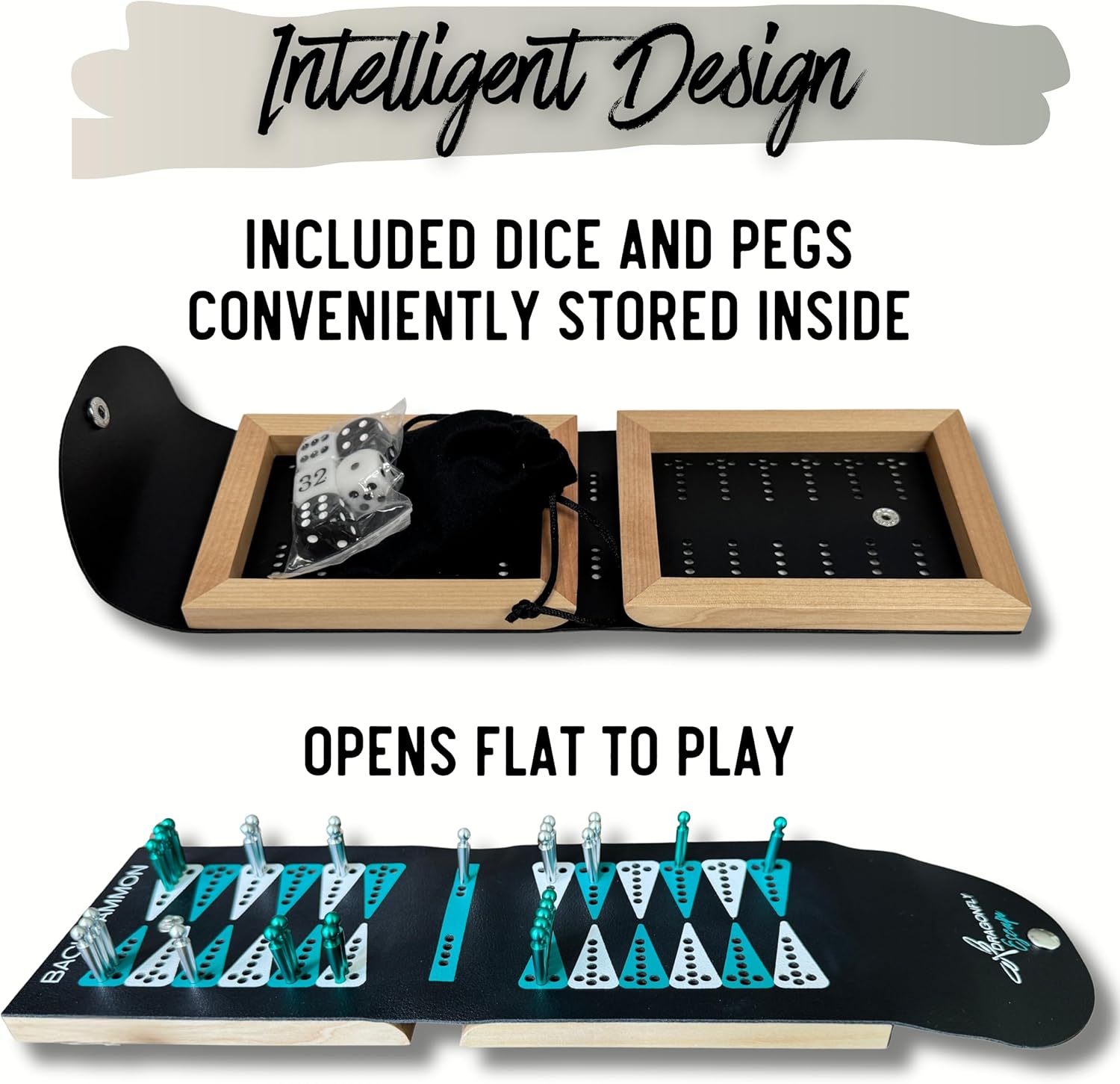 Folding Travel Backgammon Set | Pocket Backgammon Game – Folding PU Leather Board with Pegs, Dice, Doubling Cube & Drawstring Bag – Great for Flights, Beach, Camping