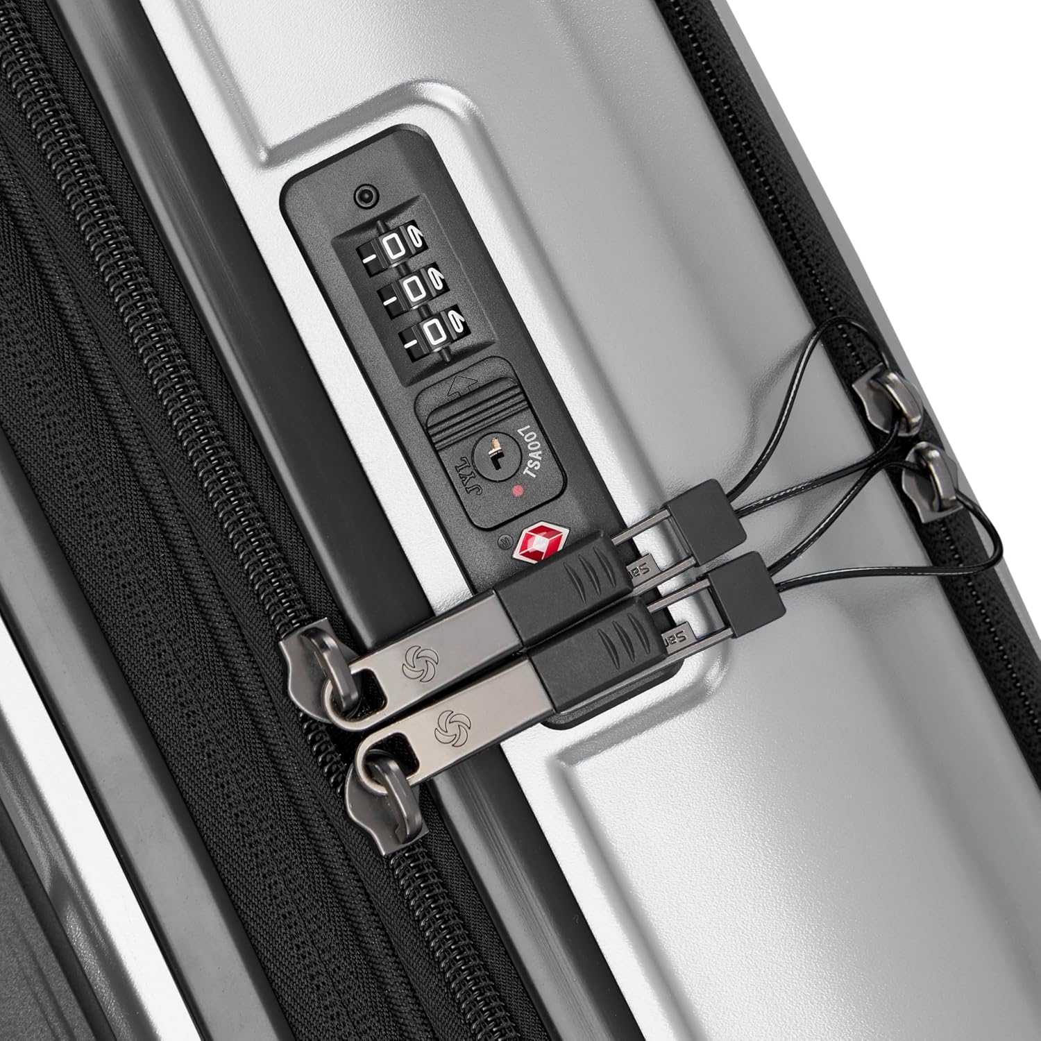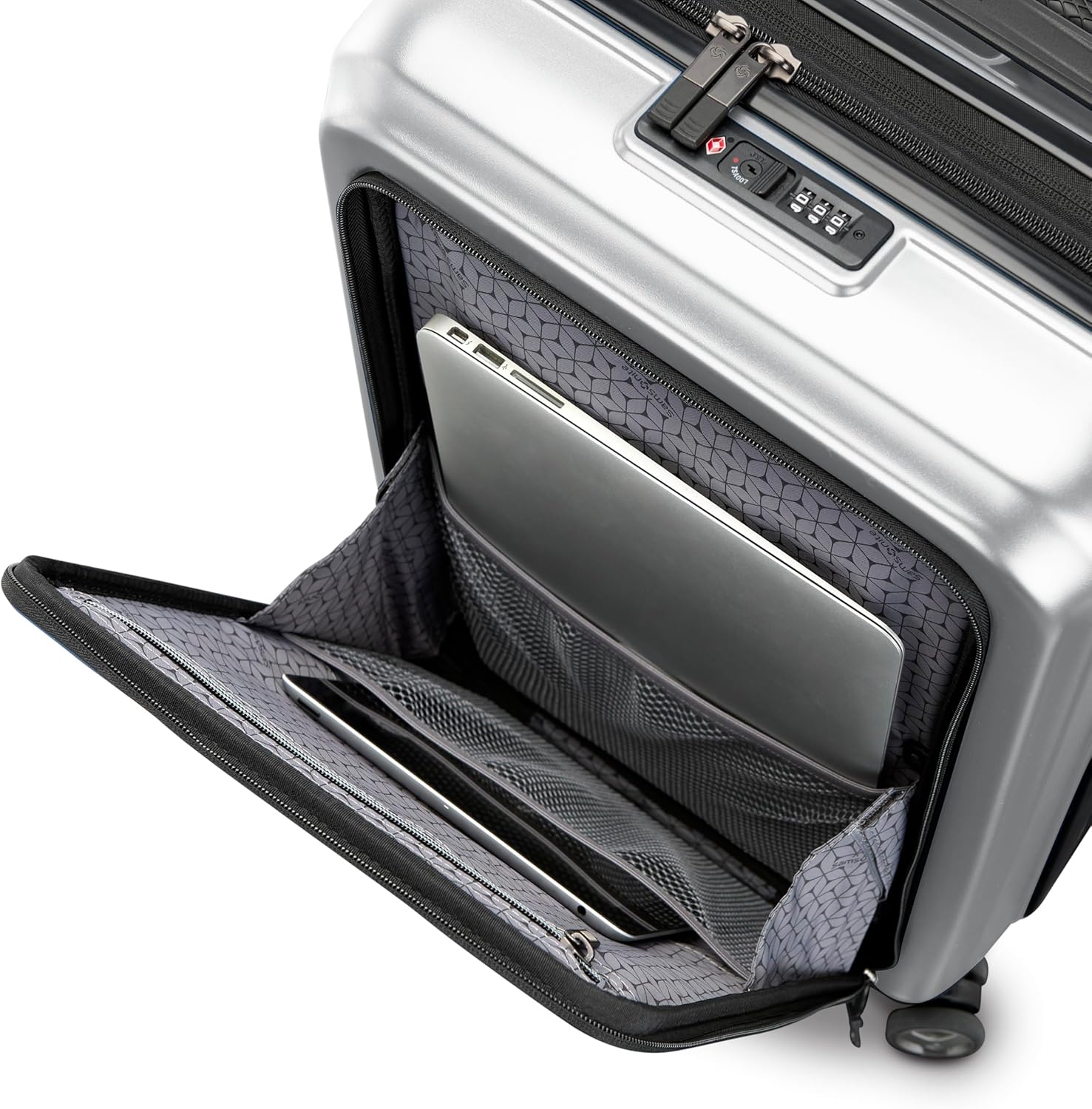 - Octiv Pro 3-Piece Set in (Aluminum Silver) (21” with Front Pocket, 24”, 28”): Includes the 21-inch Carry-On Pro with a built-in, easy-access front padded pocket for essentials, Medium 24-inch and Large 28-inch hardside expandable checked luggage. The Carry-On Pro’s padded fabric front pocket includes a dedicated protective sleeve for a laptop or tablet (up to 16in) & organized compartments for your essentials. Each suitcase is lightweight, made from durable, scratch resistant polycarbonate that is built to withstand impact and resist cracking. The Carry-On Pro fits in most overhead bins.