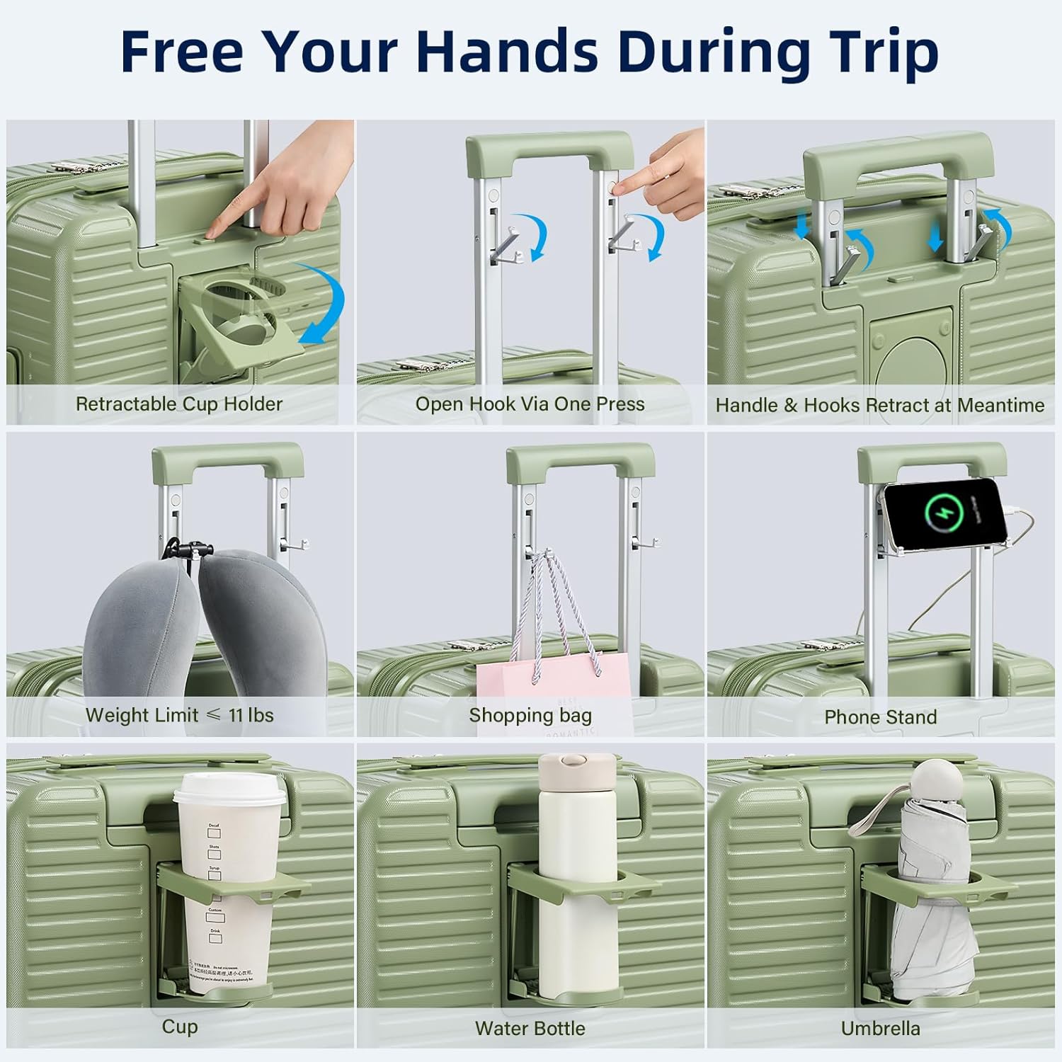 - 【Cup / Phone Holders & 2 Charging Ports】24 inch suitcase with spinner wheels fearures a universal cup holder for most water bottles, coffee mugs and tumblers. Retractable dual hooks securely hold various persoanl items like phone, iPad, U-shape throw pillow, handbag, etc (up to 11 lbs). Built-in charging ports allow on-the-go power access for Type-C / USB devices (portable power bank not included). Multifuncational green luggage to set your hands free during layover at airport / train station.