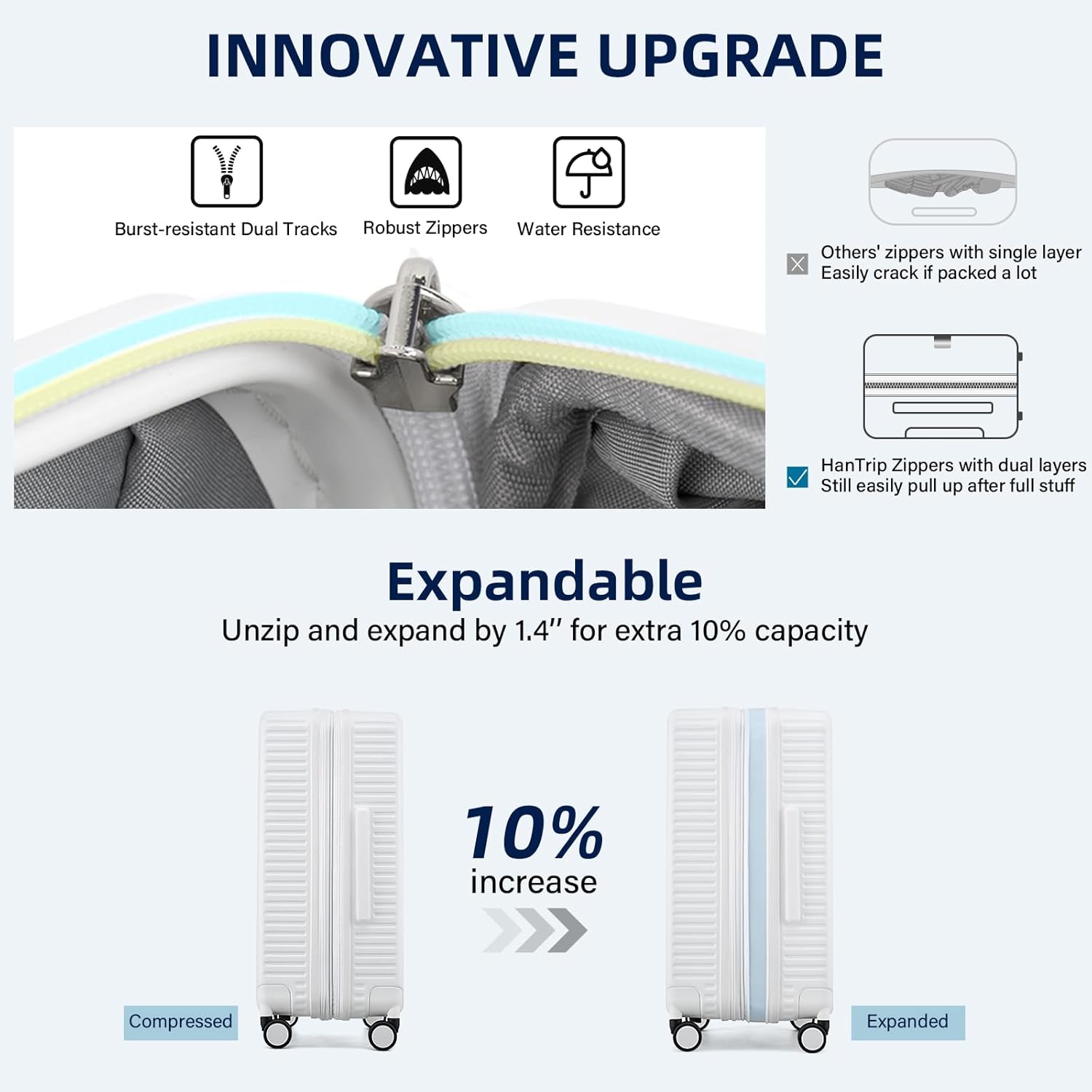 - 【Expandable Luggage Maximized Space】HanTrip two piece luggage set with spinner wheels, suitcases of both sizes boast a built-in power bank pocket, a wet / dry seperate zone and 2 big compartments, large capacity for over 10 days’ personal items and travel essentials. For extra room, just unzippper and expand the suitcases by 10% space. Excellent durable luggage set for travelers of large capacity demand.